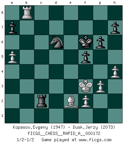 Last move : 1/2-1/2 2015 May 23 11:28:37 [Event "FICGS__CHESS__RAPID_A__000172"] [Site "FICGS"] [Date "2015.02.11"] [Round "1"] [White "Kopasov,Evgeny"] [Black "Dusk,Jerzy"] [Result "1/2-1/2"] [WhiteElo "1947"] [BlackElo "2073"] 1.d4 Nf6 2.c4 e6 3.Nc3 Bb4 4.Qc2 O-O 5.Nf3 c5 6.dxc5 Na6 7.g3 Nxc5 8.Bg2 Nce4 9.O-O Nxc3 10.bxc3 Be7 11.e4 d6 12.e5 dxe5 13.Nxe5 Qc7 14.Qe2 Bd6 15.Bf4 Ne8 16.c5 Qxc5 17.c4 Qc7 18.Rab1 f6 19.Nd3 Rb8 20.c5 Bxf4 21.Nxf4 Qxc5 22.Nxe6 Qe7 23.Rfe1 Bxe6 24.Qxe6+ Qxe6 25.Rxe6 Rf7 26.Ra6 bxa6 27.Rxb8 Re7 28.Bf1 g6 29.Bxa6 Kg7 30.Kg2 f5 31.a4 Nd6 32.Bd3 Rc7 33.a5 Kf6 34.h4 Rc3 35.Be2 Rc2 36.Kf3 Rc3+ 37.Kg2 Rc2 38.Kf3 1/2-1/2 Nimzo-Indian : Classical variation Kingside Castling by player Black (move 4) Kingside Castling by player White (move 9) This chess game ended in a draw. Follow this game move after move (download)If I win a tournament, I win it by myself. I do the playing. Nobody helps me. (Bobby Fischer) Es hat in meinem Leben Zeiten gegeben, da ich sehr nahe daran war zu glauben, daß ich auch nicht eine einzige Schachpartie verlieren könnte. (José Raúl Capablanca) Estaba muy claro de que el punto vulnerable del Gran Maestro Americano (Bobby Fischer) radicaba en las posiciones de doble filo, colgantes, irracionales, donde el siempre falló en encontrar un triunfo aún en una posición de clara victoria. (Efim Geller) On a dit que l'homme se distingue de l'animal par le fait qu'il achète plus de livres qu'il ne peut en lire. Je voudrais suggérer qu'inclure à la liste des livres quelques livres d'échecs rendrait la distinction manifeste. (Edward Lasker) I fear not the man who has practiced 10,000 kicks once, but I fear the man who has practiced one kick 10,000 times. (Bruce Lee)
