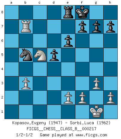 Last move : 1/2-1/2 2015 June 6 4:3:12 [Event "FICGS__CHESS__CLASS_B__000217"] [Site "FICGS"] [Date "2015.02.11"] [Round "1"] [White "Kopasov,Evgeny"] [Black "Sorbi,Luca"] [Result "1/2-1/2"] [WhiteElo "1947"] [BlackElo "1962"] 1.d4 Nf6 2.c4 e6 3.Nc3 Bb4 4.Qc2 O-O 5.Nf3 c5 6.dxc5 Na6 7.g3 Nxc5 8.Bg2 b6 9.O-O Bb7 10.Nb5 Be4 11.Qd1 Nb7 12.a3 Be7 13.Bf4 Rc8 14.Rc1 a6 15.Nc3 Bxf3 16.Bxf3 Na5 17.Qd3 Nxc4 18.b3 Nxa3 19.Bb7 Rc5 20.Na4 Rxc1 21.Rxc1 d5 22.Bc7 Qe8 23.Nxb6 Bb4 24.Qxa6 Qb5 25.Rc6 Re8 26.Na4 Nd7 27.Bd6 Bxd6 28.Rxd6 Nc5 29.Qxb5 Nxb5 30.Rb6 Nxb7 31.Rxb7 Nd6 32.Rd7 Nb5 33.Nc5 Kf8 34.Rb7 Nd6 35.Ra7 Nb5 36.Rb7 1/2-1/2 Nimzo-Indian : Classical variation Kingside Castling by player Black (move 4) Kingside Castling by player White (move 9) This chess game ended in a draw. Follow this game move after move (download)I'd rather have a Pawn than a finger. (Reuben Fine) Meine Liebe ist Schach, Schach, Schach. Ich muss jeden Tag Schach spielen, deshalb fühle ich mich so stark. (Miguel Najdorf) No soy una persona materialista y por eso, no resiento la falta o pérdida del dinero. La ausencia de cosas mundanas carece de importancia. Ya que el Ajedrez es una forma en la que puedo ser tan materialista como yo desee sin tener la necesidad de vender mi alma. (Jamie Walter Adams) Les échecs sont utiles à l'exercice de la faculté de penser et à celle de l'imagination. Car nous devons posséder une méthode élaborée pour atteindre des buts partout où nous devons conduire notre raison. (Leibnitz) The various flowers seem good to different people. (Chinese proverb)