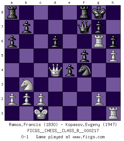 Last move : 0-1 2015 March 12 15:27:43 [Event "FICGS__CHESS__CLASS_B__000217"] [Site "FICGS"] [Date "2015.02.11"] [Round "1"] [White "Ramos,Francis"] [Black "Kopasov,Evgeny"] [Result "0-1"] [WhiteElo "1830"] [BlackElo "1947"] 1.e4 c5 2.Nf3 d6 3.d4 cxd4 4.Nxd4 Nf6 5.Nc3 a6 6.Be3 e5 7.Nb3 Be6 8.f3 Be7 9.Nd5 Nxd5 10.exd5 Bf5 11.Bd3 Bxd3 12.Qxd3 Nd7 13.O-O-O Bg5 14.Rde1 O-O 15.h4 Bxe3+ 16.Rxe3 f5 17.f4 e4 18.Qd4 Nf6 19.h5 h6 20.Rg3 Qc7 21.Rc3 Qf7 22.Rg3 Nxd5 23.Rg6 Nxf4 0-1 Sicilian : Najdorf, Byrne (English) attack Queenside Castling by player White (move 13) Kingside Castling by player Black (move 14) Player Black won this chess game. Follow this game move after move (download)In complicated positions, Bobby Fischer hardly had to be afraid of anybody. (Paul Keres) Es macht mich traurig, wenn ich sehe, dass Golfprofis mehr verdienen als Schachsportler. Obwohl ich davon überzeugt bin, dass wir Schachspieler viel härter trainieren müssen als die Golfer. (Alexandra Kosteniuk) El Ajedrez es tan inspirador que yo no creo que un buen jugador sea capaz de tener un pensamiento malo durante una partida. (Wilhelm Steinitz) Ce qui est bien, c'est d'avoir tout un tas de pièces en prise : l'adversaire ne peut en prendre qu'une à la fois. Cité par Thierry Audin. I have opinions of my own - strong opinions - but I don't always agree with them. (George Bush)