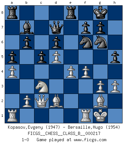 Last move : 1-0 2015 July 6 15:23:39 [Event "FICGS__CHESS__CLASS_B__000217"] [Site "FICGS"] [Date "2015.02.11"] [Round "1"] [White "Kopasov,Evgeny"] [Black "Bersaille,Hugo"] [Result "1-0"] [WhiteElo "1947"] [BlackElo "1954"] 1.d4 e6 2.c4 Bb4+ 3.Nc3 b6 4.Qc2 Bb7 5.a3 Bxc3+ 6.Qxc3 d6 7.f3 Qh4+ 8.g3 Qe7 9.e4 Nf6 10.Bg2 c5 11.Ne2 Nc6 12.d5 exd5 13.cxd5 Ne5 14.Qc2 O-O 15.f4 Ng6 16.O-O Rfe8 17.Nc3 h5 18.h3 Qd7 19.Bd2 a5 20.a4 1-0 This chess game has been lost on time (started : 2015.02.11 11:55:10) Queen's pawn : Franco-Indian (Keres) defense Kingside Castling by player Black (move 14) Kingside Castling by player White (move 16) Player White won this chess game. Follow this game move after move (download)No one ever won a game by resigning. (Unknown) Es ist nicht das erste mal, dass sich die FIDE dem Arabischen Geld gebeugt hat (über die FIDE WM 2004 in Lybien). (Larry Evans) Los tropiezos estan todos ahí en el tablero, esperando que se cometan. (Savielly Tartakover) Les Echecs, c'est l'art de la guerre sans les charniers, c'est la résurrection des morts tombés au champ d'honneur, l'espoir perpétuel, la suprématie de l'intelligence sur la force, la culture de l'esprit. (F. Szpiner) War is the child of passion, passion is the child of narcissism and narcissism is the child. (...) Another game ? (Thibault de Vassal)