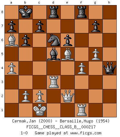 Last move : 1-0 2015 June 24 2:1:25 [Event "FICGS__CHESS__CLASS_B__000217"] [Site "FICGS"] [Date "2015.02.11"] [Round "1"] [White "Cermak,Jan"] [Black "Bersaille,Hugo"] [Result "1-0"] [WhiteElo "2000"] [BlackElo "1954"] 1.d4 Nc6 2.d5 Ne5 3.e4 e6 4.dxe6 fxe6 5.Nc3 b6 6.f4 Nf7 7.Bd2 Bb7 8.Nf3 Nf6 9.Bd3 Bb4 10.Qe2 Qe7 11.a3 Bxc3 12.Bxc3 d6 13.O-O-O O-O-O 14.e5 dxe5 15.Nxe5 Nxe5 16.Bxe5 Nd7 17.Bd4 Rhf8 18.Rhf1 Kb8 19.Bxh7 Qh4 20.Bd3 Qxh2 21.g4 Qg3 22.Bb5 Nf6 23.g5 Ne4 24.Rd3 Qh4 25.Be5 Bd5 26.a4 Nd6 27.Ba6 1-0 This chess game has been lost on time (started : 2015.02.11 11:55:10) Queen's pawn : Lundin (Kevitz-Mikenas) defense Queenside Castling by player White (move 13) Queenside Castling by player Black (move 13) Player White won this chess game. Follow this game move after move (download)Only sissies Castle. (Rob Sillars) Im Fernschach kannst du während dem Spiel rauchen. (John Christen Knudsen) La partida mas dura de ganar es una partida ganada. (Emanuel Lasker) Il n'y a plus de joueurs du niveau de Jacob Murray dont la seule quête est le beau jeu, le plaisir de voir les pièces construire quelque chose. Sur 10 idées à la minute, 9 seront sans intérêt, la dernière s'avèrera géniale. (Christian Bauer) No man has ever achieved immortality in his own life time. (Unknown)