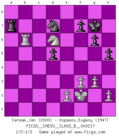 Last move : 1/2-1/2 2015 September 8 22:46:40 [Event "FICGS__CHESS__CLASS_B__000217"] [Site "FICGS"] [Date "2015.02.11"] [Round "1"] [White "Cermak,Jan"] [Black "Kopasov,Evgeny"] [Result "1/2-1/2"] [WhiteElo "2000"] [BlackElo "1947"] 1.d4 Nf6 2.c4 e6 3.Nf3 b6 4.g3 Ba6 5.b3 d5 6.Bg2 Bb4+ 7.Bd2 Be7 8.cxd5 exd5 9.Nc3 O-O 10.O-O Bb7 11.Qc2 Na6 12.Rfd1 Qc8 13.a3 c5 14.Rac1 h6 15.Bf4 Qe6 16.dxc5 bxc5 17.b4 cxb4 18.Nd4 Qd7 19.axb4 Nxb4 20.Qf5 Rfd8 21.Qxd7 Rxd7 22.Bh3 R7d8 23.Ncb5 Bc8 24.Bxc8 Rdxc8 25.Rxc8+ Rxc8 26.Nf5 Bf8 27.Nxa7 Rc5 28.f3 h5 29.Rb1 Ra5 30.Bd6 Bxd6 31.Nxd6 Rxa7 32.Rxb4 g6 33.Kf2 Kg7 34.Rb6 Nd7 1/2-1/2 Queen's Indian : Nimzovich variation (exaggerated Fianchetto) Kingside Castling by player Black (move 9) Kingside Castling by player White (move 10) This chess game ended in a draw. Follow this game move after move (download)The only thing Chess players have in common is Chess. (Lodewijk Prins) Früher wurde jeder komplizierte Zug, jedes interessante Opfer mit großem Beifall und Enthusiasmus aufgenommen. Heute schaltet man einfach seinen Fritz an, und man kann sehen, was los ist, ob der Zug geht oder nicht. (Vladimir Kramnik) Jugadores de primera clase pierden en contra de jugadores de segunda clase porque los jugadores de segunda clase a veces juegan una partida de primer clase. (Siegbert Tarrasch) Plusieurs personnes se sont demandées comment Tal faisait pour gagner... En fait, c'est très simple ! Il met ses pièces au centre de l'échiquier et les sacrifie quelque part ! (David Bronstein) Treat your password like your toothbrush. Don't let anybody else use it, and get a new one every six months. (Clifford Stoll)