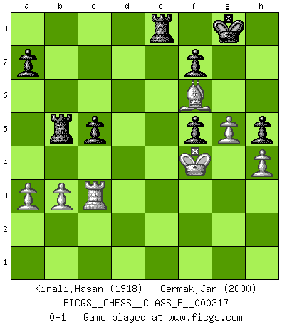 Last move : 0-1 2015 July 13 14:35:41 [Event "FICGS__CHESS__CLASS_B__000217"] [Site "FICGS"] [Date "2015.02.11"] [Round "1"] [White "Kirali,Hasan"] [Black "Cermak,Jan"] [Result "0-1"] [WhiteElo "1918"] [BlackElo "2000"] 1.d4 Nf6 2.c4 e6 3.Nf3 b6 4.Nc3 Bb7 5.a3 d5 6.Qc2 Be7 7.Bf4 O-O 8.e3 c5 9.Rd1 Nbd7 10.cxd5 Nxd5 11.Nxd5 exd5 12.Bd3 Nf6 13.dxc5 bxc5 14.O-O Qb6 15.Be5 g6 16.b3 Rac8 17.h3 Rfe8 18.Rfe1 Bf8 19.Bh2 Bg7 20.Rc1 Ne4 21.Nd2 Nc3 22.Nb1 d4 23.e4 Bh6 24.Nxc3 dxc3 25.Qxc3 Bxc1 26.Rxc1 Bxe4 27.Bc4 Qd8 28.f3 Bc6 29.Be5 Qg5 30.Bf6 Qf4 31.Bh8 Qe3+ 32.Qxe3 Rxe3 33.Bf6 R3e8 34.Kf2 Bd7 35.f4 Rc6 36.Be5 Rb6 37.g4 Be6 38.Bxe6 Rbxe6 39.g5 Rb6 40.Rc3 h6 41.h4 h5 42.Kf3 Rc8 43.Ke4 Rd8 44.f5 Rb5 45.Bf6 Re8+ 46.Kf4 gxf5 0-1 Queen's Indian : 4.Nc3 Kingside Castling by player Black (move 7) Kingside Castling by player White (move 14) Player Black won this chess game. Follow this game move after move (download)Life is like a game of Chess, changing with each move. (Chinese proverb) Computer sind die einzigen Gegner, die nicht immer eine Ausrede auf Lager haben, wenn sie gegen mich verlieren. (Robert James Fischer) El Ajedrez es imaginación. (David Bronstein) Même si vous avez un bon coup à faire, regardez toujours s'il n'y en a pas un qui lui soit préférable. (Pedro Damiano) All the biggest technological inventions created by man - the airplane, the automobile, the computer - says little about his intelligence, but speaks volumes about his laziness. (Mark Kennedy)