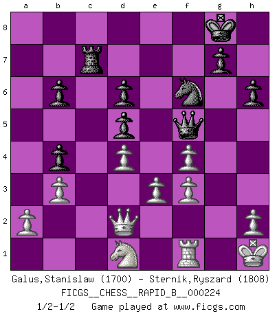 Last move : 1/2-1/2 2015 March 13 8:15:41 [Event "FICGS__CHESS__RAPID_B__000224"] [Site "FICGS"] [Date "2015.02.12"] [Round "1"] [White "Galus,Stanislaw"] [Black "Sternik,Ryszard"] [Result "1/2-1/2"] [WhiteElo "1700"] [BlackElo "1808"] 1.d4 f5 2.g3 Nf6 3.Bg2 e6 4.Nf3 d5 5.O-O Bd6 6.c4 O-O 7.Nc3 Nc6 8.cxd5 exd5 9.Nb5 Be6 10.Ng5 Qe7 11.Nxd6 cxd6 12.e3 Rac8 13.f3 Bd7 14.Bd2 Na5 15.Re1 Nc4 16.Bc1 Na5 17.b3 Rfe8 18.Qd2 b6 19.Ba3 h6 20.Nh3 Rc7 21.Nf2 Rec8 22.Bf1 Rc2 23.Qd1 R2c7 24.Bd3 Qe6 25.Qd2 Nc6 26.Rac1 a5 27.Nd1 Re8 28.Nc3 Nb4 29.Bxb4 axb4 30.Nd1 Rxc1 31.Qxc1 f4 32.gxf4 Qh3 33.Rf1 Qh5 34.Rf2 Bh3 35.Kh1 Rc8 36.Qd2 Rc7 37.Bf1 Bxf1 38.Rxf1 Qf5 1/2-1/2 Dutch defense Kingside Castling by player White (move 5) Kingside Castling by player Black (move 6) This chess game ended in a draw. Follow this game move after move (download)I play correspondence chess because it is both art and science while chess is art only. (A player at FICGS) Die jungen Leute sollen verstehen, dass sie noch etwas von mir lernen können und müssen. (Viktor Kortschnoi) Morphy probablemente fue el genio más grande de todos. (Bobby Fischer) Dans le domaine de la peinture, de la gravure et de la sculpture, dès la première décennie de notre siècle, les artistes abandonnent la représentation de la partie d'échecs pour se concentrer sur les pièces, sur les échiquiers et sur toutes les variations auxquelles les unes et les autres peuvent donner lieu. On passe en quelque sorte d'un thème social à un thème musical (au sens de la musica médiévale, c'est-à-dire d'une notion qui inclue le rythme, l'harmonie, la construction et la déconstruction, etc.). Graphiquement et picturalement, l'échiquier apparaît comme une structure ouverte, dynamique, d'une richesse infinie, autorisant toutes les combinatoires et débouchant sur des mouvements et des rythmes de nature exponentielle. (Michel Pastoureau) Mandala - that's it! 16x16 squares as multiple of the four and the eight because of the Four Noble Truths and the Noble Eightfold Path. (Heinz-Georg Lehnhoff about Big Chess)
