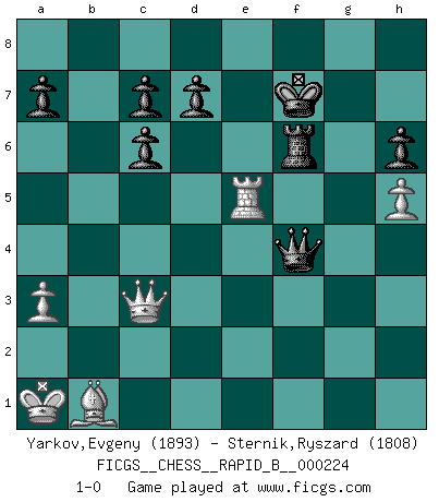 Last move : 1-0 2015 April 19 9:59:43 [Event "FICGS__CHESS__RAPID_B__000224"] [Site "FICGS"] [Date "2015.02.12"] [Round "1"] [White "Yarkov,Evgeny"] [Black "Sternik,Ryszard"] [Result "1-0"] [WhiteElo "1893"] [BlackElo "1808"] 1.e4 e5 2.Nf3 Nc6 3.d4 exd4 4.Nxd4 Nf6 5.Nxc6 bxc6 6.e5 Qe7 7.Qe2 Nd5 8.c4 Ba6 9.b3 Qh4 10.a3 Bc5 11.g3 Bxf2+ 12.Qxf2 Qe4+ 13.Kd1 Qxh1 14.Nd2 Nc3+ 15.Kc2 Ne4 16.Nxe4 Qxe4+ 17.Bd3 Qg4 18.Bf5 Qh5 19.h4 f6 20.exf6 gxf6 21.Bb2 O-O 22.g4 Qf7 23.Rg1 Bxc4 24.bxc4 Qxc4+ 25.Kb1 Rab8 26.Ka1 Rf7 27.g5 fxg5 28.Rxg5+ Kf8 29.Qg3 Rf6 30.Qe5 Qf1+ 31.Bb1 Rxb2 32.Qxb2 Kf7 33.h5 Qf4 34.Re5 h6 35.Qc3 1-0 Scotch : Mieses variation Kingside Castling by player Black (move 21) Player White won this chess game. Follow this game move after move (download)There are tough players and nice guys, and I'm a tough player. (Bobby Fischer) Spiel ein langweiliges Spiel zu Ende und lustige Dinge können passieren. (Hans Ree) El Ajedrez tiene tanto misterio como las mujeres. (Purdy) J'ai toujours senti une vague pitié pour l'homme qui ne connaît rien aux échecs, tout comme j'en aurais pour un homme ignorant de l'amour. Les Echecs, comme la musique ou comme l'amour, ont le pouvoir de rendre heureux. (Siegbert Tarrasch) There are lots of people who mistake their imagination for their memory. (Josh Bilings)