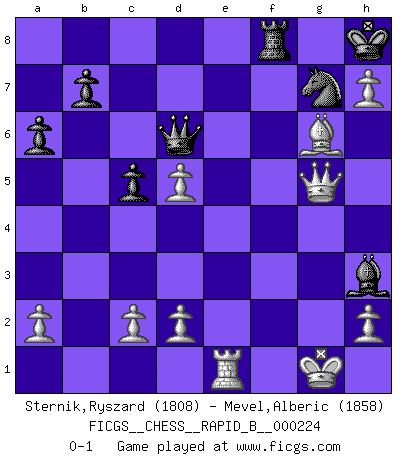 Last move : 0-1 2015 May 1 21:24:27 [Event "FICGS__CHESS__RAPID_B__000224"] [Site "FICGS"] [Date "2015.02.12"] [Round "1"] [White "Sternik,Ryszard"] [Black "Mevel,Alberic"] [Result "0-1"] [WhiteElo "1808"] [BlackElo "1858"] 1.b4 e5 2.Bb2 Bxb4 3.Bxe5 Nf6 4.Nc3 Ba5 5.Nf3 O-O 6.e3 Re8 7.Be2 c6 8.O-O d5 9.Bf4 Nbd7 10.Qe1 Nc5 11.Nd4 Ne6 12.Nxe6 Bxe6 13.Bd3 c5 14.Nb5 Nh5 15.Be5 a6 16.Na3 d4 17.Qe2 g6 18.f4 f6 19.f5 Bd5 20.Nc4 fxe5 21.fxg6 Ng7 22.gxh7+ Kh8 23.Nxa5 Qxa5 24.Bg6 Rf8 25.exd4 Qb6 26.Qxe5 Bxg2 27.Rxf8+ Rxf8 28.Qe7 Rc8 29.Qg5 Bh3 30.Re1 Qd6 31.d5 Rf8 0-1 Polish (Sokolsky) opening Kingside Castling by player Black (move 5) Kingside Castling by player White (move 8) Player Black won this chess game. Follow this game move after move (download)We cannot resist the fascination of sacrifice, since a passion for sacrifices is part of a Chessplayer's nature. (Rudolf Spielman) Je mehr ich von der FIDE weiss, um so weniger verstehe ich. (Alexander Kalifman) Los finales de Peón son del Ajedrez lo que el cesped es del Golf. (Cecil Purdy) Toute estimation doit être constamment réévaluée. (Jacob Estrin) Animated gif is worth one mega-word. (Unknown)