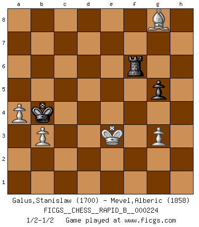Last move : 1/2-1/2 2015 June 7 12:59:25 [Event "FICGS__CHESS__RAPID_B__000224"] [Site "FICGS"] [Date "2015.02.12"] [Round "1"] [White "Galus,Stanislaw"] [Black "Mevel,Alberic"] [Result "1/2-1/2"] [WhiteElo "1700"] [BlackElo "1858"] 1.d4 d5 2.c4 dxc4 3.Nf3 Nf6 4.e3 e6 5.Bxc4 c5 6.O-O a6 7.dxc5 Bxc5 8.Qxd8+ Kxd8 9.Rd1+ Ke7 10.Be2 Rd8 11.Nbd2 Bd7 12.Nc4 Nc6 13.Ne1 Kf8 14.Nd3 Be7 15.Bd2 Be8 16.Nb6 Rab8 17.Rac1 Nd5 18.Nxd5 Rxd5 19.e4 Nd4 20.Bf1 R5d8 21.Be3 Ba4 22.b3 Bb5 23.f4 Ba3 24.Rc3 Bc6 25.Rc4 Nb5 26.Bb6 Rdc8 27.Bc5+ Ke8 28.Re1 b6 29.Bxa3 Nxa3 30.R4c1 Bb7 31.Ne5 Nc2 32.Re2 Nd4 33.Rxc8+ Rxc8 34.Rd2 Rd8 35.Kf2 Bxe4 36.Bxa6 f6 37.Nc4 b5 38.Rxd4 Rxd4 39.Bxb5+ Ke7 40.Ke3 e5 41.fxe5 fxe5 42.Nxe5 Rb4 43.Nc6+ Bxc6 44.Bxc6 Kd6 45.Be4 h6 46.Bd3 Kc5 47.Bc4 Rb8 48.a4 Re8+ 49.Kf3 Rf8+ 50.Ke3 Kb4 51.h4 g5 52.hxg5 hxg5 53.g3 Rf6 54.Bg8 1/2-1/2 QGA : Classical, 6...a6 Kingside Castling by player White (move 6) 10 pieces endgame at move 44 : White KBPPPP , Black KRPP WHITE : King + 1 Bishop 4 Pawns BLACK : King + 1 Rook 2 Pawns 9 pieces endgame at move 52 : White KBPPPP , Black KRP WHITE : King + 1 Bishop 4 Pawns BLACK : King + 1 Rook 1 Pawn 8 pieces endgame at move 52 : White KBPPP , Black KRP WHITE : King + 1 Bishop 3 Pawns BLACK : King + 1 Rook 1 Pawn This chess game ended in a draw. Follow this game move after move (download)Man is a frivolous, a specious creature, and like a Chess player, cares more for the process of attaining his goal than for the goal itself. (Dostoyevsky) Der Umstand, daß uns eine 7 Stunden Zeitkontrolle ermöglicht eine großartige, tiefe Partie zu spielen, ist für die Massenmedien nicht weiter von Bedeutung. (Alexej Shirov) Al jugar al Ajedrez entonces, podemos aprender: Primero: Previsión... Segundo: Prudencia... Tercero: Cautela... Y al final, aprendemos del Ajedrez el hábito de no ser desanimados por apariencias malas presentes en el estado de nuestros asuntos, el hábito de la esperanza por una oportunidad favorable y la perseveración de los secretos de los recursos. (Benjamin Franklin) A ce moment-là, je menaçais de comprendre la position ! (Clément L'Heureux) I live to kill Traxler counterattack. (Ilmars Cirulis)