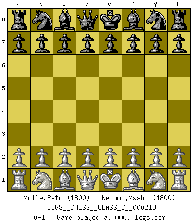 Last move : 0-1 2015 April 5 17:54:31 [Event "FICGS__CHESS__CLASS_C__000219"] [Site "FICGS"] [Date "2015.02.23"] [Round "1"] [White "Molle,Petr"] [Black "Nezumi,Mashi"] [Result "0-1"] [WhiteElo "1800"] [BlackElo "1800"] 0-1 This chess game has been lost on time (started : 2015.02.23 12:5:24) Player Black won this chess game. Follow this game move after move (download)A thorough understanding of the typical mating continuations makes the most complicated sacrificial combinations leading up to them not only not difficult, but almost a matter of course. (Siegbert Tarrasch) Der Partner hat auch seine Existenzberechtigung. (Savielly Grigorievitsch Tartakower) De eso se trata el Ajedrez. Un día le das una lección a tu oponente y al día siguiente el te da una a tí. (Bobby Fischer) Les Echecs ont trois composantes : le temps, l'espace et le matériel en dernier. (Mikhail Tal) Unless I accept my faults I will most certainly doubt my virtues. (Hugh Prather)