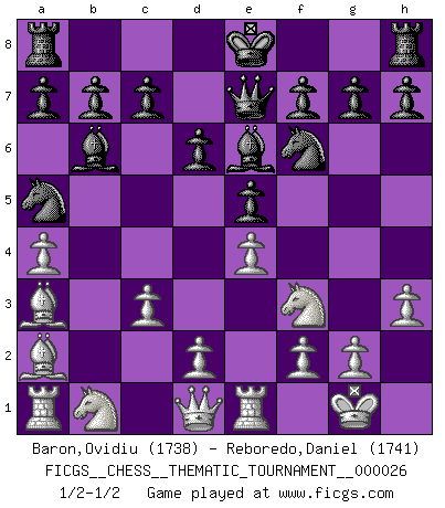 Last move : 1/2-1/2 2007 March 9 3:16:34 [Event "FICGS__CHESS__THEMATIC_TOURNAMENT__000026"] [Site "FICGS"] [Date "2007.03.01"] [Round "1"] [White "Baron,Ovidiu"] [Black "Reboredo,Daniel"] [Result "1/2-1/2"] [WhiteElo "1738"] [BlackElo "1741"] 1.e4 e5 2.Nf3 Nc6 3.Bc4 Bc5 4.b4 Bxb4 5.c3 Ba5 6.O-O d6 7.h3 Bb6 8.a4 Na5 9.Ba2 Nf6 10.Re1 Qe7 11.Ba3 Be6 1/2-1/2 Evans gambit Kingside Castling by player White (move 6) This chess game ended in a draw. Follow this game move after move (download)I played Chess with him and would have beaten him sometimes only he always took back his last move, and ran the game out differently. (Mark Twain) Wenn ich gewinne bin ich ein Genie. Wenn nicht, dann bin ich keines. (Robert James Fischer) Siempre es mejor sacrificar los hombres de tu oponente. (Savielly Tartakower) Votre seul travail dans les ouvertures est d'obtenir un milieu de partie jouable. (Lajos Portish) A cynic is a man who knows the price of everything but the value of nothing. (Oscar Wilde)