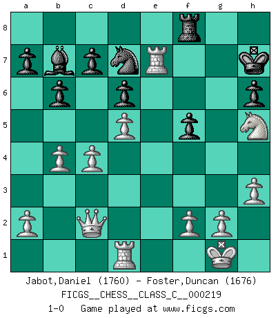 Last move : 1-0 2015 April 28 15:43:8 [Event "FICGS__CHESS__CLASS_C__000219"] [Site "FICGS"] [Date "2015.02.23"] [Round "1"] [White "Jabot,Daniel"] [Black "Foster,Duncan"] [Result "1-0"] [WhiteElo "1760"] [BlackElo "1676"] 1.e4 b6 2.d4 Bb7 3.Bd3 e6 4.Nf3 h6 5.O-O g6 6.d5 Bg7 7.Re1 Ne7 8.c4 O-O 9.Nc3 d6 10.Be3 e5 11.Qd2 Kh7 12.Rad1 Nd7 13.h3 f5 14.exf5 Nxf5 15.b3 Nxe3 16.Rxe3 Nc5 17.Bc2 Qe7 18.b4 Nd7 19.Nd4 Qh4 20.Ne6 Rf5 21.Bxf5 gxf5 22.Qc2 e4 23.Nxe4 Qh5 24.Nxg7 Kxg7 25.Ng3 Rf8 26.Nxh5+ Kh7 27.Re7+ 1-0 Owen defense Kingside Castling by player White (move 5) Kingside Castling by player Black (move 8) Player White won this chess game. Follow this game move after move (download)Not all artists are Chess players, but all Chess players are artists. (Marcel Duchamp) Ich möchte Schüler heranbilden, die das Vermögen haben, selbst zu denken und Kritik zu üben. (Emanuel Lasker) Por la belleza de sus partidas, la claridad de su juego y lo brillante de sus ideas, Fischer se creó el mismo como un artista de la misma estatura como Brahms, Rembrandt y Shakespeare. (David Levy) Aucun coup ne doit être joué sans but. (Pedro Damiano) There are three kinds of lies: lies, damned lies and statistics. (Mark Twain)