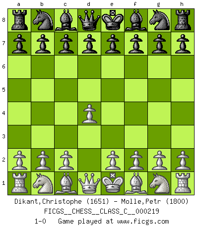Last move : 1-0 2015 April 6 5:56:31 [Event "FICGS__CHESS__CLASS_C__000219"] [Site "FICGS"] [Date "2015.02.23"] [Round "1"] [White "Dikant,Christophe"] [Black "Molle,Petr"] [Result "1-0"] [WhiteElo "1651"] [BlackElo "1800"] 1.d4 1-0 This chess game has been lost on time (started : 2015.02.23 12:5:24) Queen's pawn Player White won this chess game. Follow this game move after move (download)Live, lose, and learn, by observing your opponent how to win. (Amber Steenbock) Es hat in meinem Leben Zeiten gegeben, da ich sehr nahe daran war zu glauben, daß ich auch nicht eine einzige Schachpartie verlieren könnte. (José Raúl Capablanca) Mis oponentes también hacen buenas movidas. A veces yo no tomo esas cosas en consideración. (Bobby Fischer) Le jeu d'échecs est comme rejeté hors du temps. (Antoine de Saint-Exupéry) When you've done things right people won't know you've done anything at all. (Futurama)