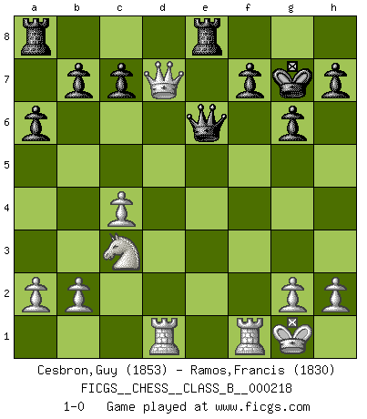 Last move : 1-0 2015 April 30 18:5:55 [Event "FICGS__CHESS__CLASS_B__000218"] [Site "FICGS"] [Date "2015.02.24"] [Round "1"] [White "Cesbron,Guy"] [Black "Ramos,Francis"] [Result "1-0"] [WhiteElo "1853"] [BlackElo "1830"] 1.d4 Nf6 2.Nf3 g6 3.c4 Bg7 4.Nc3 O-O 5.e4 d6 6.Be2 e5 7.Be3 exd4 8.Nxd4 Nc6 9.O-O Re8 10.f3 Nxd4 11.Bxd4 Be6 12.Qd2 Qd7 13.Rad1 a6 14.f4 Bg4 15.Bxg4 Qxg4 16.e5 dxe5 17.fxe5 Nd7 18.e6 Qxe6 19.Bxg7 Kxg7 20.Qxd7 1-0 King's Indian : East Indian defense Kingside Castling by player Black (move 4) Kingside Castling by player White (move 9) Player White won this chess game. Follow this game move after move (download)Chess is the gymnasium of the mind. (Blaise Pascal) Kasparov ist eine Art Monster mit hundert Augen, denen auch nicht das Geringste entgeht. (Tony Miles) Vive, pierde y aprende al observar a tu oponente como gana. (Amber Steenbock) L'ordinateur a tué l'originalité. Il n'y a plus guère d'aventures sur l'échiquier. (Jacob Murray) Thus, what is of supreme importance in war is to attack the enemy's strategy. (Sun Tzu)