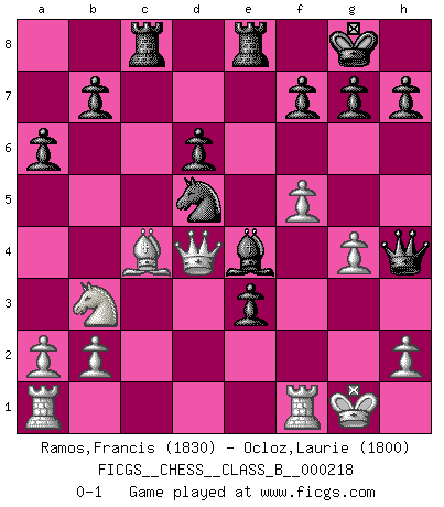 Last move : 0-1 2015 March 1 4:54:46 [Event "FICGS__CHESS__CLASS_B__000218"] [Site "FICGS"] [Date "2015.02.24"] [Round "1"] [White "Ramos,Francis"] [Black "Ocloz,Laurie"] [Result "0-1"] [WhiteElo "1830"] [BlackElo "1800"] 1.e4 c5 2.Nf3 d6 3.d4 cxd4 4.Nxd4 Nf6 5.Nc3 a6 6.Be3 e5 7.Nb3 Be6 8.f3 Be7 9.Nd5 Nxd5 10.exd5 Bf5 11.Be2 Nd7 12.O-O Bg5 13.Qd2 Bxe3+ 14.Qxe3 Bxc2 15.Kh1 O-O 16.f4 Re8 17.f5 Nf6 18.g4 Rc8 19.Bf3 e4 20.Be2 Nxd5 21.Qd4 e3 22.Kg1 Be4 23.Bc4 Qh4 0-1 Sicilian : Najdorf, Byrne (English) attack Kingside Castling by player White (move 12) Kingside Castling by player Black (move 15) Player Black won this chess game. Follow this game move after move (download)It is not enough to be a good player... you must also play well. (Siegbert Tarrasch) Der Umstand, daß uns eine 7 Stunden Zeitkontrolle ermöglicht eine großartige, tiefe Partie zu spielen, ist für die Massenmedien nicht weiter von Bedeutung. (Alexej Shirov) Prefiero perder una partida realmente buena, que ganar una mala. (David Levy) Dans le domaine de la peinture, de la gravure et de la sculpture, dès la première décennie de notre siècle, les artistes abandonnent la représentation de la partie d'échecs pour se concentrer sur les pièces, sur les échiquiers et sur toutes les variations auxquelles les unes et les autres peuvent donner lieu. On passe en quelque sorte d'un thème social à un thème musical (au sens de la musica médiévale, c'est-à-dire d'une notion qui inclue le rythme, l'harmonie, la construction et la déconstruction, etc.). Graphiquement et picturalement, l'échiquier apparaît comme une structure ouverte, dynamique, d'une richesse infinie, autorisant toutes les combinatoires et débouchant sur des mouvements et des rythmes de nature exponentielle. (Michel Pastoureau) There is a computer disease that anybody who works with computers knows about. It's a very serious disease and it interferes completely with the work. The trouble with computers is that you 'play' with them ! (Richard P. Feynman)