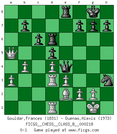 Last move : 0-1 2015 July 11 11:37:2 [Event "FICGS__CHESS__CLASS_B__000218"] [Site "FICGS"] [Date "2015.02.24"] [Round "1"] [White "Gouldar,Frances"] [Black "Duenas,Alexis"] [Result "0-1"] [WhiteElo "1831"] [BlackElo "1973"] 1.d4 d5 2.c4 e6 3.cxd5 exd5 4.Nc3 c6 5.Nf3 Nf6 6.Bf4 Bd6 7.Bxd6 Qxd6 8.e3 Nbd7 9.Bd3 O-O 10.O-O Re8 11.Qc2 Nf8 12.Rfe1 Be6 13.Rad1 Bg4 14.Be2 Bxf3 15.Bxf3 Rad8 16.a3 a5 17.Qa4 Qc7 18.h3 Ne6 19.Be2 Ng5 20.Rd3 Rd6 21.b4 Qe7 22.Qxa5 Nfe4 23.Nxe4 Qxe4 24.Red1 Nxh3+ 0-1 Queen's gambit declined Kingside Castling by player Black (move 9) Kingside Castling by player White (move 10) Player Black won this chess game. Follow this game move after move (download)On the chessboard, lies and hypocrisy do not survive long. (Emanuel Lasker) Wer mein Gambit spielt, muß bereit sein, alle Brücken hinter sich abzubrechen. Es verändert den ganzen Menschen. Es wirkt wie ein Zauberstab und fördert verkümmerte, gute Charakter- eigenschaften wieder zu Tage. (Emil Joseph Diemer) Me gusta decir que Bobby Fischer fue el mejor jugador que jamás haya existido. Pero lo que hizo de Fischer un genio, fue su habilidad de mezclar una frescura y pragmatismo Americano con ideas Rusas acerca de la estrategia. (Bruce Pandolfini) À la honte des hommes, on sait que les lois du jeu sont les seules qui soient partout justes, claires, inviolables et exécutées. Pourquoi l'Indien qui a donné les règles du jeu d'échecs est-il obéi de bon gré dans toute la terre, et que les décrétales des papes, par exemple, sont aujourd'hui un objet d'horreur et de mépris ? C'est que l'inventeur des échecs combina tout avec justesse pour la satisfaction des joueurs, et que les papes, dans leurs décrétales, n'eurent en vue que leur seul avantage. L'Indien voulut exercer également l'esprit des hommes et leur donner du plaisir; les papes ont voulu abrutir l'esprit des hommes. Voltaire (Dictionnaire philosophique / Garnier 1967) . 'gn is not allowed in chess unless n is an integer between 1 and 8 inclusive, where 1 and 8 are to interpreted as the standard numerals standing for integers in the ordered real-closed field R, with the *canonical* ordering. (As opposed to, say, an integer in the domain Z[2+i*sqrt(5)] or an integer in some exotic Grothendieck topos). (Normajean Yates)