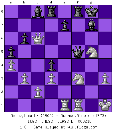 Last move : 1-0 2015 February 24 22:41:37 [Event "FICGS__CHESS__CLASS_B__000218"] [Site "FICGS"] [Date "2015.02.24"] [Round "1"] [White "Ocloz,Laurie"] [Black "Duenas,Alexis"] [Result "1-0"] [WhiteElo "1800"] [BlackElo "1973"] 1.e4 c5 2.Nf3 Nc6 3.Bb5 g6 4.O-O Bg7 5.Re1 Nf6 6.e5 Nd5 7.Nc3 Nc7 8.Bxc6 dxc6 9.Ne4 Ne6 10.d3 Qc7 11.Be3 b6 12.a4 a5 13.Qc1 h6 14.h3 Rb8 15.Bd2 Ba6 16.Bc3 O-O 17.Nh4 Rbd8 18.f4 Nd4 19.Qd2 Bc8 20.Qf2 Be6 21.Rf1 Qb7 22.Rae1 Qc7 23.b3 Rd5 24.g4 Bc8 25.Kh1 R5d8 26.Nf3 Qd7 27.Qg2 Qc7 28.Bxd4 cxd4 29.f5 Bxe5 30.fxg6 fxg6 31.g5 hxg5 32.Qxg5 Bg7 33.Qxg6 Qf4 34.Neg5 Qf5 35.Qxc6 1-0 Sicilian : Nimzovich-Rossolimo attack (with ...g6, without ...d6) Kingside Castling by player White (move 4) Kingside Castling by player Black (move 16) Player White won this chess game. Follow this game move after move (download)I have added these principles to the law: get the Knights into action before both Bishops are developed. (Emanuel Lasker) Ich kenne Menschen, die allen Willen der Welt besitzen und doch nicht Schach spielen können. (Robert James Fischer) El jugador de combinación piensa hacia adelante; comienza de la posición dada y trabaja las movidas contundentes en su mente. (Emanuel Lasker) Le succès, c'est être capable d'aller d'échec en échec sans perdre son enthousiasme. (Winston Churchill) Art is the triumph over chaos. (John Cheever)