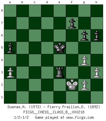 Last move : 1/2-1/2 2015 May 18 19:25:13 [Event "FICGS__CHESS__CLASS_B__000218"] [Site "FICGS"] [Date "2015.02.24"] [Round "1"] [White "Duenas,Alexis"] [Black "Fierry Fraillon,David"] [Result "1/2-1/2"] [WhiteElo "1973"] [BlackElo "1892"] 1.d4 Nf6 2.c4 g6 3.Nc3 d5 4.cxd5 Nxd5 5.e4 Nxc3 6.bxc3 Bg7 7.Bc4 O-O 8.Ne2 c5 9.O-O Nc6 10.Be3 Qc7 11.Rc1 Rd8 12.Bf4 Be5 13.Bg3 Bxg3 14.fxg3 Ne5 15.Qb3 Nxc4 16.Qxc4 e6 17.Nf4 b6 18.d5 exd5 19.Nxd5 Qe5 20.Rcd1 Be6 21.Qb3 c4 22.Qxc4 Rac8 23.Qa4 Kg7 24.h3 a5 25.g4 Bxd5 26.exd5 Rxd5 27.Qb3 R8c5 28.Rxd5 Rxd5 29.Qxb6 Qxc3 30.Qa7 Qd4+ 31.Qxd4+ Rxd4 32.Rf3 h6 33.Re3 Ra4 34.a3 Kf6 35.Rf3+ Ke5 36.Re3+ Re4 37.Kf2 Rxe3 1/2-1/2 King's Indian defense, 3.Nc3 Kingside Castling by player Black (move 7) Kingside Castling by player White (move 9) This chess game ended in a draw. Follow this game move after move (download)The stomach is an essential part of the Chess master. (Bent Larsen) Über Karpov: Er war und ist ein Vertreter der russischen Reaktionäre. Das steckt tief in seiner Seele, wehalb ich nicht nett mit ihm umgehen kann. (Viktor Kortschnoi) ¿Porque tengo que perder ante este idiota?. (Aron Nimzovich) Si le désir cupide (et stupide) de gagner est une inépuisable source de souffrance, une combinaison brillante sur l'échiquier est une découverte : le coquelicot qui s'épanouit lorsque apparaît la Voie Lactée. (Arrabal) Lottery : A tax on people who are bad at math. (Author unknown)