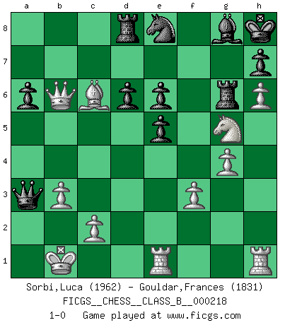 Last move : 1-0 2015 August 19 10:8:9 [Event "FICGS__CHESS__CLASS_B__000218"] [Site "FICGS"] [Date "2015.02.24"] [Round "1"] [White "Sorbi,Luca"] [Black "Gouldar,Frances"] [Result "1-0"] [WhiteElo "1962"] [BlackElo "1831"] 1.e4 c5 2.Nf3 d6 3.d4 cxd4 4.Nxd4 Nf6 5.Nc3 g6 6.Be3 Bg7 7.f3 O-O 8.Qd2 Nc6 9.O-O-O Nxd4 10.Bxd4 Be6 11.Kb1 a6 12.h4 Nh5 13.Bxg7 Nxg7 14.g4 f6 15.h5 g5 16.h6 Ne8 17.e5 fxe5 18.Ne4 Kh8 19.Nxg5 Bg8 20.Bd3 Qc7 21.Bf5 Rf6 22.Qe3 Rd8 23.Rde1 Qa5 24.a3 Qd5 25.b3 e6 26.Be4 Qa5 27.Bxb7 Qxa3 28.Qb6 Rb8 29.Qa7 Rd8 30.Bc6 Rg6 31.Qb6 1-0 Sicilian : Dragon, Yugoslav attack, 7...O-O Kingside Castling by player Black (move 7) Queenside Castling by player White (move 9) Player White won this chess game. Follow this game move after move (download)Chess is life. (Bobby Fischer) Wenn Schach ein enormer Dschungel ist, der seine Myriaden von Geheimnissen nicht preisgeben will, dann sind Computer die Kettensägen einer gewaltigen ökologisch unsensiblen Nutzholzfirma. (Nigel Short) Yo nunca en mi vida he jugado la Defensa Francesa, que viene siendo la más aburrida de todas las Aperturas. (Wilhelm Steinitz) Karpov est une pièce de musée. (Garry Kasparov) You lose, general Kenobi. (General Grievous in Star Wars ep.3)