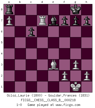 Last move : 1-0 2015 July 13 10:47:2 [Event "FICGS__CHESS__CLASS_B__000218"] [Site "FICGS"] [Date "2015.02.24"] [Round "1"] [White "Ocloz,Laurie"] [Black "Gouldar,Frances"] [Result "1-0"] [WhiteElo "1800"] [BlackElo "1831"] 1.e4 e6 2.d4 d5 3.Nc3 dxe4 4.Nxe4 Nd7 5.g3 Ngf6 6.Nxf6+ Nxf6 7.Bg2 c5 8.Nf3 cxd4 9.Qxd4 Qxd4 10.Nxd4 Bc5 11.Nb3 Bb6 12.O-O O-O 13.Bf4 Re8 14.Be5 Nd7 15.Bd6 e5 16.Rfe1 Nf6 17.c4 e4 18.a4 Be6 19.a5 Bd8 20.Nc5 Bxc4 21.Nxe4 Bb5 22.Bc5 Bc6 23.Nxf6+ Bxf6 24.Rxe8+ Rxe8 25.Bxc6 bxc6 26.a6 Bxb2 27.Ra2 Bf6 28.Bxa7 Be7 29.Be3 Ra8 30.a7 Bd6 31.Rd2 Be7 32.Rd7 1-0 French : Rubinstein variation Kingside Castling by player White (move 12) Kingside Castling by player Black (move 12) Player White won this chess game. Follow this game move after move (download)Whoever sees no other aim in the game than that of giving checkmate to one's opponent will never become a good Chess player. (Euwe) Ich war schon mal beim Dopingtest. Da musste ich Urin abgeben, während Dritte zusahen. (Elisabeth Pähtz) Fischer sacrificó virtualmente todo lo que la mayoría de nosotros los 'debiles' (término que él usa) valoramos, respetamos y apreciamos por el amor de un astuto, a menudo hermoso tablero de juego, por el privilegio ambivalente de ser su mas grande maestro. (Paul Kollar) Vous m'avez demandé de vous exposer quel est le fondement de la prière. Je ne fais que préparer les pièces du jeu sur la table... Nous sera-t-il permis d'en adopter les règles et si nous les appliquons scrupuleusement nous ne tarderons pas à faire mat le Roi divin ! Il ne pourra échapper à nos mains. (Sainte Thérèse d'Avila, Chemin de perfection) The obstacle is the path. (Zen proverb)