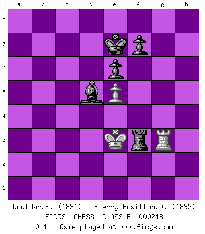 Last move : 0-1 2015 October 8 11:47:43 [Event "FICGS__CHESS__CLASS_B__000218"] [Site "FICGS"] [Date "2015.02.24"] [Round "1"] [White "Gouldar,Frances"] [Black "Fierry Fraillon,David"] [Result "0-1"] [WhiteElo "1831"] [BlackElo "1892"] 1.Nf3 Nf6 2.d4 g6 3.c4 Bg7 4.Nc3 d5 5.cxd5 Nxd5 6.e4 Nxc3 7.bxc3 c5 8.Bb5+ Nc6 9.O-O cxd4 10.cxd4 O-O 11.Be3 Bg4 12.Bxc6 bxc6 13.Rc1 Qa5 14.Qd2 Qxd2 15.Nxd2 Rfd8 16.Rxc6 Bxd4 17.Bxd4 Rxd4 18.Nb3 Ra4 19.f3 Be6 20.Rc2 a5 21.Nc1 Rc8 22.Rxc8+ Bxc8 23.Rd1 Be6 24.Rd2 g5 25.h3 h5 26.Kf2 Ra3 27.Ke2 g4 28.hxg4 hxg4 29.f4 Bc4+ 30.Kd1 Re3 31.e5 Kg7 32.Rd4 Bf1 33.Ra4 Bxg2 34.Kd2 Rf3 35.Ne2 Rf2 36.Ke1 Rf1+ 37.Kd2 e6 38.Ng3 Rf3 39.Ne2 g3 40.Rxa5 Bf1 41.Ng1 Rxf4 42.Ke3 Rc4 43.Ra3 g2 44.Kf2 Rc2+ 45.Kg3 Bc4 46.Kh2 Bd5 47.Rg3+ Kf8 48.a4 Ra2 49.Nf3 Rxa4 50.Kxg2 Rf4 51.Kf2 Ke7 52.Ke3 Rxf3+ 0-1 Reti Opening Kingside Castling by player White (move 9) Kingside Castling by player Black (move 10) 10 pieces endgame at move 49 : White KRNP , Black KRBPPP WHITE : King + 1 Rook 1 Knight 1 Pawn BLACK : King + 1 Rook 1 Bishop 3 Pawns 9 pieces endgame at move 50 : White KRNP , Black KRBPP WHITE : King + 1 Rook 1 Knight 1 Pawn BLACK : King + 1 Rook 1 Bishop 2 Pawns 8 pieces endgame at move 52 : White KRP , Black KRBPP WHITE : King + 1 Rook 1 Pawn BLACK : King + 1 Rook 1 Bishop 2 Pawns Player Black won this chess game. Follow this game move after move (download)The stomach is an essential part of the Chess master. (Bent Larsen) Modernes Schach erfordert enorme Anspannung. Es ist für einen normalen Menschen unmöglich das auszuhalten. (Viktor Kortschnoi) Me dio la sensación de como si yo estuviera jugando en contra del mismo Ajedrez. - al estar jugando en contra de Robert Fischer (Walter Shipman) Des points faibles ou des trous dans la position de l'adversaire doivent être occupés par des pièces et non pas par des pions. (Siegbert Tarrasch) Memory is a crazy woman that hoards colored rags and throws away food. (Austin O'Malley)