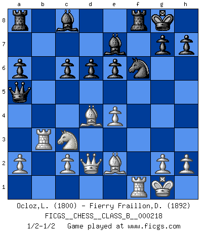 Last move : 1/2-1/2 2015 February 26 23:34:13 [Event "FICGS__CHESS__CLASS_B__000218"] [Site "FICGS"] [Date "2015.02.24"] [Round "1"] [White "Ocloz,Laurie"] [Black "Fierry Fraillon,David"] [Result "1/2-1/2"] [WhiteElo "1800"] [BlackElo "1892"] 1.e4 c5 2.Nf3 d6 3.d4 cxd4 4.Nxd4 Nf6 5.Nc3 a6 6.Bg5 e6 7.f4 Qb6 8.Qd2 Qxb2 9.Rb1 Qa3 10.f5 Nc6 11.fxe6 fxe6 12.Nxc6 bxc6 13.Be2 Be7 14.O-O O-O 15.Rb3 Qc5+ 16.Be3 Qe5 17.Bd4 Qa5 18.Bb6 Qe5 19.Bd4 Qa5 1/2-1/2 Sicilian : Najdorf, 7...Qb6 Kingside Castling by player White (move 14) Kingside Castling by player Black (move 14) This chess game ended in a draw. Follow this game move after move (download)Chess is a foolish expedient for making idle people believe they are doing something very clever when they are only wasting their time. (George Bernard Shaw) Auf Remis zu spielen ist gewissermaßen ein Verbrechen gegen das Schachspiel. (Mikhail Nekhemyevich Tal) El Ajedrez se juega con la mente... ¡no con las manos!. (Renaud y Kahn) Il n'y a pas de prix trop élevé au scalp de l'ennemi. (Koblentz) The Internet is the first thing that humanity has build that humanity doesn't understand, the largest experiment in anarchy that we have ever had. (Eric Schmidt)