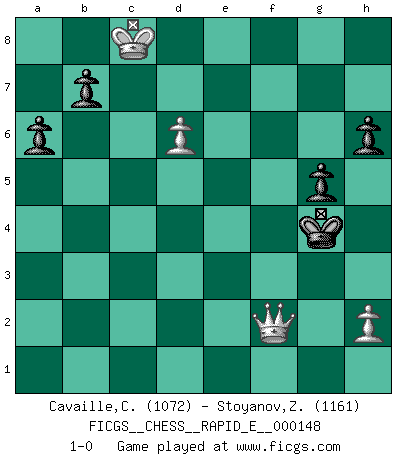 Last move : 1-0 2015 March 16 16:22:9 [Event "FICGS__CHESS__RAPID_E__000148"] [Site "FICGS"] [Date "2015.02.28"] [Round "1"] [White "Cavaille,Cedric"] [Black "Stoyanov,Zdravko"] [Result "1-0"] [WhiteElo "1072"] [BlackElo "1161"] 1.e4 c5 2.Nf3 a6 3.d4 cxd4 4.Nxd4 e5 5.Nf3 d6 6.Nc3 Nc6 7.Bg5 Be7 8.Qd2 h6 9.Bxe7 Qxe7 10.Rd1 Bg4 11.Qxd6 Rd8 12.Qxe7+ Ngxe7 13.Rxd8+ Nxd8 14.Nxe5 Bh5 15.Nd5 Nxd5 16.exd5 O-O 17.Be2 Bxe2 18.Kxe2 Re8 19.f4 f6 20.f5 Rxe5+ 21.Kf3 Rxf5+ 22.Ke4 Rf2 23.c4 Rxg2 24.b4 Rxa2 25.c5 Rb2 26.Rd1 Rxb4+ 27.Rd4 Rb3 28.d6 Ne6 29.d7 f5+ 30.Kd5 Nd8 31.Kd6 g5 32.Kc7 Ne6+ 33.Kc8 f4 34.Re4 Kf7 35.Rxe6 Rd3 36.Rd6 Rxd6 37.cxd6 f3 38.d8Q f2 39.Qd7+ Kg6 40.Qe6+ Kh5 41.Qf7+ Kg4 42.Qxf2 1-0 Sicilian : O'Kelly variation Kingside Castling by player Black (move 16) 10 pieces endgame at move 37 : White KPPP , Black KPPPPP WHITE : King + 3 Pawns BLACK : King + 5 Pawns Promotion Queen by player White (move 38) 9 pieces endgame at move 42 : White KQPP , Black KPPPP WHITE : King + 1 Queen 2 Pawns BLACK : King + 4 Pawns Player White won this chess game. Follow this game move after move (download)In order to improve your game, you must study the endgame before everything else, for whereas the endings can be studied and mastered by themselves, the middle game and the opening must be studied in relation to the endgame. (Jose Raul Capablanca) Ich möchte Schüler heranbilden, die das Vermögen haben, selbst zu denken und Kritik zu üben. (Emanuel Lasker) De todos mis libros Rusos, la defensa contiene y difunde el 'calor' mas grande que pudiese verse extraño al observar lo supremamente abstracto que el Ajedrez supuestamente es. (Vladimir Nabokov) Un footballeur joue avec ses pieds, parfois avec sa tête. Un joueur d'échecs ne joue qu'avec sa tête. Et quand il ne joue plus, il meurt. (Jacob Murray) In every real man a child is hidden that wants to play. (Friedrich Nietzsche)