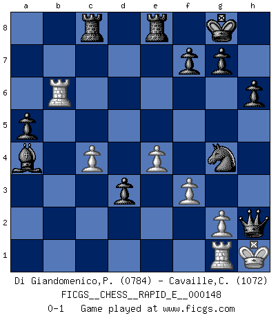 Last move : 0-1 2015 April 5 17:15:27 [Event "FICGS__CHESS__RAPID_E__000148"] [Site "FICGS"] [Date "2015.02.28"] [Round "1"] [White "Di Giandomenico,Pierino"] [Black "Cavaille,Cedric"] [Result "0-1"] [WhiteElo "0784"] [BlackElo "1072"] 1.e4 c5 2.Nc3 e6 3.Nf3 d6 4.d3 Nf6 5.Be2 Be7 6.O-O Nc6 7.Bg5 O-O 8.Re1 h6 9.Bf4 Re8 10.a3 e5 11.Bg3 Nd4 12.Nxd4 cxd4 13.Nb5 Bd7 14.Qd2 Bxb5 15.c3 dxc3 16.bxc3 Rc8 17.c4 Ba4 18.Qb4 Bc6 19.a4 a5 20.Qa3 b6 21.Bg4 Nxg4 22.Red1 Bh4 23.Qxd6 Qxd6 24.Rab1 Bxg3 25.hxg3 Qc5 26.d4 exd4 27.f3 Bxa4 28.Re1 d3 29.Kh1 Qf2 30.Rg1 Qxg3 31.Rxb6 Qh2+ 0-1 Sicilian : Closed Kingside Castling by player White (move 6) Kingside Castling by player Black (move 7) Player Black won this chess game. Follow this game move after move (download)There are tough players and nice guys, and I'm a tough player. (Bobby Fischer) Habe Mut, dich deines eigenen Verstandes zu bedienen. (Immanuel Kant) Antes de los Finales, los dioses han colocado el Juego Medio. (Siegbert Tarrasch) On entre au jeu d'Echecs comme on entre en Religion. Pour le joueur d'Echecs, la partie d'Echecs c'est l'office, la messe, le défilé du 1er Mai, le dépôt de gerbe au Monument aux Morts. C'est un drame sacré. (Michel Roos) Computer Science is no more about computers than astronomy is about telescopes. (Edsger W. Dijkstra)