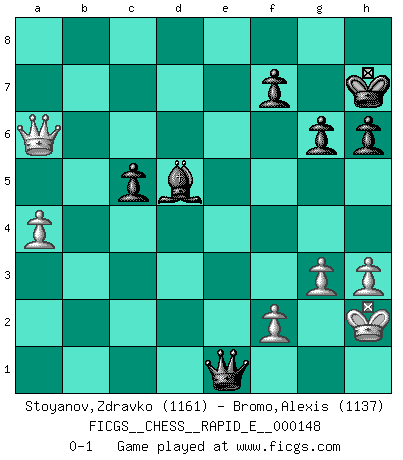 Last move : 0-1 2015 April 15 9:32:39 [Event "FICGS__CHESS__RAPID_E__000148"] [Site "FICGS"] [Date "2015.02.28"] [Round "1"] [White "Stoyanov,Zdravko"] [Black "Bromo,Alexis"] [Result "0-1"] [WhiteElo "1161"] [BlackElo "1137"] 1.e4 e5 2.Nf3 Nc6 3.Bb5 d6 4.Bxc6+ bxc6 5.h3 Nf6 6.d3 Bb7 7.O-O h6 8.a3 Be7 9.Re1 O-O 10.Be3 Re8 11.c3 a5 12.Qb3 Qb8 13.Nbd2 a4 14.Qc2 Nh5 15.Qd1 Nf4 16.Bxf4 exf4 17.Nd4 d5 18.Qg4 Bc8 19.Qxf4 Bg5 20.Qg3 Bxd2 21.Re2 Bg5 22.Nxc6 Qb6 23.Nb4 dxe4 24.Rxe4 Rxe4 25.dxe4 Be6 26.Rd1 c5 27.Nd3 Bf6 28.e5 Bg5 29.Nf4 Bxf4 30.Qxf4 Rd8 31.Rxd8+ Qxd8 32.Qxa4 Qd5 33.b3 Qxb3 34.Qa8+ Kh7 35.Qe4+ g6 36.a4 Qxc3 37.Qa8 Qe1+ 38.Kh2 Qxe5+ 39.g3 Bd5 40.Qa6 Qe1 0-1 Ruy Lopez : Old Steinitz defense Kingside Castling by player White (move 7) Kingside Castling by player Black (move 9) Player Black won this chess game. Follow this game move after move (download)Bobby is the finest Chess player this country ever produced. His memory for the moves, his brilliance in dreaming up combinations, and his fierce determination to win are uncanny. (John Collins) Die Auseinandersetzung mit Karpow war politisch geprägt. Er stand für das kommunistische System, wurde von dessen Repräsentanten gehätschelt. Ich war der Oppositionelle. Jeder Schachweltmeister spiegelt auch die gesellschaftlichen Verhältnisse wider. Kramnik steht für die Börsen-Generation des Neuen Markts, ideologiefrei, zahlenfixiert. (Garry Kasparov) Yo he agregado estos principios a la ley: pongan los Caballos en acción antes de que los dos Alfiles sean desarrollados. (Emanuel Lasker) Ce n'est pas pour s'amuser qu'il joue aux échecs : il célèbre un culte. (Vladimir Nabokov) Life is verb, not a noun. (Charlotte Perkins Gilman)