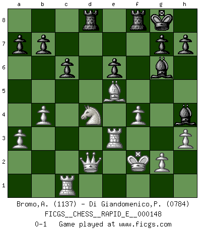 Last move : 0-1 2015 May 22 10:45:25 [Event "FICGS__CHESS__RAPID_E__000148"] [Site "FICGS"] [Date "2015.02.28"] [Round "1"] [White "Bromo,Alexis"] [Black "Di Giandomenico,Pierino"] [Result "0-1"] [WhiteElo "1137"] [BlackElo "0784"] 1.d4 d5 2.c4 dxc4 3.Nc3 Be6 4.Nf3 Qd6 5.a3 Nc6 6.e3 Nf6 7.h3 Nd5 8.Bxc4 Bf5 9.Bxd5 Qd7 10.Bxc6 Qxc6 11.O-O Rd8 12.Re1 e6 13.e4 Bg6 14.b4 Qxc3 15.Bf4 c6 16.Re3 Qxd4 17.Nxd4 Be7 18.Rc1 O-O 19.f3 Bf6 20.e5 Be7 21.Kf2 f6 22.Qd2 fxe5 23.Bxe5 Bg5 24.f4 Bh4+ 0-1 This chess game has been lost on time (started : 2015.02.28 18:59:12) Queen's gambit accepted Kingside Castling by player White (move 11) Kingside Castling by player Black (move 18) Player Black won this chess game. Follow this game move after move (download)The passed pawn is a criminal, who should be kept under lock and key. Mild measures, such as police surveillance, are not sufficient. (Nimzovitch) Ich habe kein Problem mit Frauen, sondern nur mit dem Niveau ihres Schachspiels (Judith Polgar) El Ajedrez es una guerra en un tablero. El objetivo es aplastar la mente del oponente. (Bobby Fischer) Shah mat. Le roi est mort. Cri de fierté d'un joueur venant de terrasser son adversaire, courtoisement, sans effusion de sang. There will be no order, only chaos. (Sol Robeson in Pi by Darren Aronofsky)