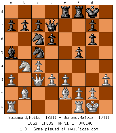 Last move : 1-0 2015 June 18 13:28:40 [Event "FICGS__CHESS__RAPID_E__000148"] [Site "FICGS"] [Date "2015.02.28"] [Round "1"] [White "Goldmund,Heike"] [Black "Benone,Mateia"] [Result "1-0"] [WhiteElo "1281"] [BlackElo "1041"] 1.b4 e5 2.Bb2 Bxb4 3.Bxe5 Nf6 4.a3 Ba5 5.c4 d6 6.Bb2 O-O 7.e3 Bg4 8.Nf3 Nc6 9.Be2 Qd7 10.O-O Ne4 11.d3 Nc5 12.Nc3 Rae8 13.h3 Bh5 14.Qc2 Bg6 15.Nh4 f5 16.Nxg6 hxg6 17.Nd5 Ne7 18.Nb4 Nc6 19.Qc3 1-0 This chess game has been lost on time (started : 2015.02.28 18:59:12) Polish (Sokolsky) opening Kingside Castling by player Black (move 6) Kingside Castling by player White (move 10) Player White won this chess game. Follow this game move after move (download)A passed Pawn increases in strength as the number of pieces on the board diminishes. (Capablanca) Ich bin stolz ein Bulgare zu sein. (Veselin Topalov) Uno no tiene que jugar muy bien, es suficiente jugar mejor que el oponente. (Siegbert Tarrasch) Aidez vos pièces, elles vous aideront. (Paul Morphy) There are two kinds of tragedy in this world, one is not getting what you want and the other is getting. (Lord of war)