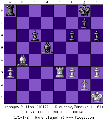 Last move : 1/2-1/2 2015 March 30 11:10:19 [Event "FICGS__CHESS__RAPID_E__000148"] [Site "FICGS"] [Date "2015.02.28"] [Round "1"] [White "Kehayov,Yulian"] [Black "Stoyanov,Zdravko"] [Result "1/2-1/2"] [WhiteElo "1017"] [BlackElo "1161"] 1.d4 d5 2.e3 a6 3.c4 dxc4 4.Bxc4 e6 5.Nf3 b5 6.Be2 Bb7 7.O-O Bd6 8.Nc3 Bb4 9.a3 Bxc3 10.bxc3 h6 11.h3 Nf6 12.c4 bxc4 13.Bxc4 O-O 14.Ne5 Nd5 15.e4 Nf6 16.f3 Nc6 17.Nxc6 Bxc6 18.d5 exd5 19.exd5 Nxd5 20.Bxd5 Bxd5 21.Be3 c6 22.Bc5 Re8 23.Re1 Qa5 24.Bb4 Qb5 25.Qc2 a5 26.Bc3 Qc5+ 27.Kh1 Re6 28.Rxe6 Bxe6 29.Qb2 f6 30.Re1 Qd5 31.Qd2 Qc4 32.Bxa5 Qb3 33.Bb4 Bd5 34.Qe3 Qxe3 35.Rxe3 1/2-1/2 Queen's pawn game Kingside Castling by player White (move 7) Kingside Castling by player Black (move 13) This chess game ended in a draw. Follow this game move after move (download)Many have become Chess Masters, no one has become the Master of Chess. (Siegbert Tarrasch) Ohne Leiden bildet sich kein Charakter. (Ernst Freiherr von Feuchtersleben) Nunca antes ha habido un jugador de Ajedrez con tal conocimiento a fondo de las complejidades del juego y una inmensa voluntad absolutamente indomable de ganar. Yo pienso que Fischer es el jugador mas grande que jamás haya existido. (Lisa Lane) Aux échecs, les retours au sommet sont rares : les dommages psychologiques consécutifs à une défaite sont trop sévères. (Daily Telegraph) Memory... is the diary that we all carry with us. (Oscar Wilde, The Importance of Being Earnest)