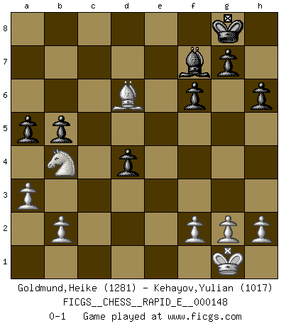Last move : 0-1 2015 June 8 19:10:25 [Event "FICGS__CHESS__RAPID_E__000148"] [Site "FICGS"] [Date "2015.02.28"] [Round "1"] [White "Goldmund,Heike"] [Black "Kehayov,Yulian"] [Result "0-1"] [WhiteElo "1281"] [BlackElo "1017"] 1.e4 e5 2.Nf3 d6 3.Bc4 h6 4.c3 Nf6 5.d4 exd4 6.Nxd4 c5 7.Nf3 Nxe4 8.Qe2 Qe7 9.Nbd2 Nxd2 10.Bxd2 Qxe2+ 11.Bxe2 Be7 12.O-O O-O 13.Rfe1 Nc6 14.Bc4 a6 15.Bd5 Bd7 16.Bxc6 Bxc6 17.Rxe7 b5 18.Rae1 Rfe8 19.Rxe8+ Rxe8 20.Rxe8+ Bxe8 21.Bf4 d5 22.Ne5 d4 23.cxd4 cxd4 24.Nd3 f6 25.Bd6 Bg6 26.Nb4 Bf7 27.a3 a5 0-1 Philidor's defense Kingside Castling by player White (move 12) Kingside Castling by player Black (move 12) Player Black won this chess game. Follow this game move after move (download)With or without the title, Bobby Fischer was unquestionably the greatest player of his time. (Burt Hochberg) Ich kenne Menschen, die allen Willen der Welt besitzen und doch nicht Schach spielen können. (Robert James Fischer) Una partida de Ajedrez se divide en 3 etapas: la primera cuando piensas que tienes la ventaja, la segunda cuando crees que tienes la ventaja y la tercera... ¡cuando te das cuenta que vas a perder!. (Savielly Tartakower) Toutes les manuvres exécutées sur une colonne ouverte ont pour but ultime l'intrusion définitive sur la septième ou la huitième rangée, en plein cur de la position ennemie. (Aaron Nimzovitch) Bobby never cared about money, though. His only desire was to prove that his choices were correct: He wanted chess to be important because he was a chess player, and he wanted to be important. Bobby knew money was important, but he didn't have a clue why, outside of clothes and status. The only way he could accomplish what he wanted was to fight for a lot of money. Once he got it, he gave it away. He did not know how to spend it. And once he'd become champion, after, essentially, sacrificing his life for it, he didn't know how to spend his time. (Bob Wade)