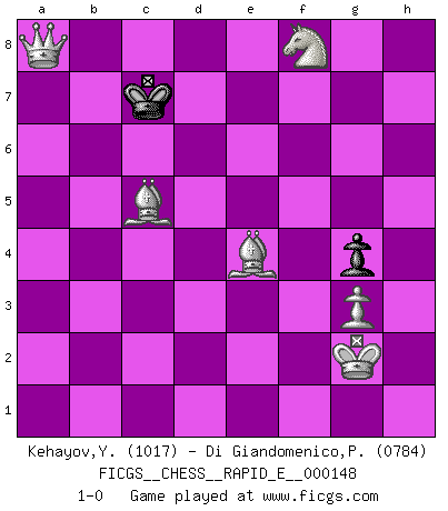 Last move : 1-0 2015 June 5 22:33:22 [Event "FICGS__CHESS__RAPID_E__000148"] [Site "FICGS"] [Date "2015.02.28"] [Round "1"] [White "Kehayov,Yulian"] [Black "Di Giandomenico,Pierino"] [Result "1-0"] [WhiteElo "1017"] [BlackElo "0784"] 1.d4 d5 2.e3 e6 3.Nf3 Nf6 4.Be2 Nc6 5.O-O Bb4 6.a3 Bd6 7.Nc3 O-O 8.Bd3 a6 9.Re1 Re8 10.e4 Qd7 11.e5 Nxe5 12.dxe5 Bxe5 13.Nxe5 Qd6 14.Nf3 e5 15.Nd2 e4 16.Bf1 Bg4 17.f3 exf3 18.Nxf3 Qc5+ 19.Qd4 Qxd4+ 20.Nxd4 Rxe1 21.Bd2 Rxa1 22.h3 b5 23.Bf4 c5 24.hxg4 Nxg4 25.Nc6 Rc1 26.Nxd5 Rc8 27.Nce7+ Kf8 28.Nxc8 Rd1 29.g3 Rxd5 30.b3 Ne3 31.Bxe3 c4 32.bxc4 bxc4 33.Bxc4 Rd1+ 34.Kg2 a5 35.Bd3 g6 36.Nd6 Ra1 37.Bc5 f5 38.Nxf5 Ke8 39.Nh6 Kd8 40.Nf7+ Ke8 41.Ng5 a4 42.Bb5+ Kd8 43.Bxa4 Kc8 44.Nxh7 Ra2 45.Nf8 Rxc2+ 46.Bxc2 g5 47.a4 g4 48.Be4 Kd8 49.a5 Ke8 50.a6 Kd8 51.a7 Kc7 52.a8Q 1-0 Queen's pawn game Kingside Castling by player White (move 5) Kingside Castling by player Black (move 7) 10 pieces endgame at move 44 : White KBBNPPP , Black KRP WHITE : King + 2 Bishops 1 Knight 3 Pawns BLACK : King + 1 Rook 1 Pawn 9 pieces endgame at move 45 : White KBBNPP , Black KRP WHITE : King + 2 Bishops 1 Knight 2 Pawns BLACK : King + 1 Rook 1 Pawn 8 pieces endgame at move 46 : White KBBNPP , Black KP WHITE : King + 2 Bishops 1 Knight 2 Pawns BLACK : King + 1 Pawn Promotion Queen by player White (move 52) Player White won this chess game. Follow this game move after move (download)Chess is above all, a fight ! (Emanuel Lasker) Wenn Schach ein enormer Dschungel ist, der seine Myriaden von Geheimnissen nicht preisgeben will, dann sind Computer die Kettensägen einer gewaltigen ökologisch unsensiblen Nutzholzfirma. (Nigel Short) Los Peones son nacidos libres, y aún así, se encuentran encadenados por todos lados. (Rick Kennedy) Ce qui caractérise les parties de combat, c'est que si le défenseur a constamment de difficiles problèmes à résoudre, l'attaquant doit chercher sans relâche de nouvelles possibilités d'attaque. (Koblentz) Gambling : The sure way of getting nothing from something. (Wilson Mizner)