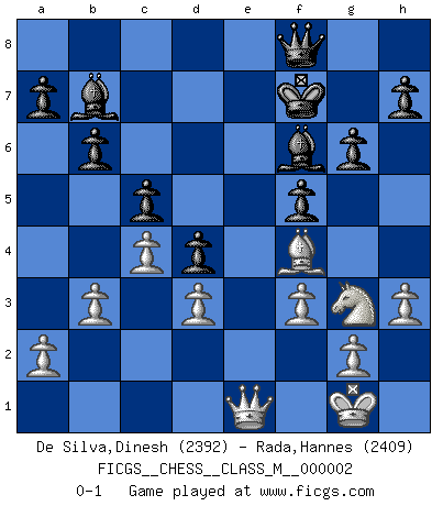 Last move : 0-1 2007 February 11 3:45:20 [Event "FICGS__CHESS__CLASS_M__000002"] [Site "FICGS"] [Date "2006.04.10"] [Round "1"] [White "De Silva,Dinesh"] [Black "Rada,Hannes"] [Result "0-1"] [WhiteElo "2392"] [BlackElo "2409"] 1.e4 c5 2.Nf3 Nc6 3.Bb5 g6 4.O-O Bg7 5.Re1 Nf6 6.e5 Ng4 7.Bxc6 dxc6 8.h3 Nh6 9.Nc3 O-O 10.Ne4 b6 11.b3 Nf5 12.Bb2 Nd4 13.d3 Qc7 14.Ng3 Rd8 15.c4 f6 16.exf6 exf6 17.Nxd4 cxd4 18.Qf3 f5 19.Bc1 Bb7 20.Bf4 Qd7 21.Qe2 Re8 22.Qd2 c5 23.f3 Re3 24.Rad1 Rxe1+ 25.Rxe1 Re8 26.Rxe8+ Qxe8 27.Kf2 Qf8 28.Qe1 Kf7 29.Kg1 Bf6 0-1 Sicilian : Nimzovich-Rossolimo attack (with ...g6, without ...d6) Kingside Castling by player White (move 4) Kingside Castling by player Black (move 9) Player Black won this chess game. Follow this game move after move (download)Kasparov : J'adoube , Ivanchuk : S'il vous plaît ! (Garry Kasparov & Vassily Ivanchuk, Linares 1997) Es hat in meinem Leben Zeiten gegeben, da ich sehr nahe daran war zu glauben, daß ich auch nicht eine einzige Schachpartie verlieren könnte. (José Raúl Capablanca) Un mal plan es mejor que no tener ningún plan. (Frank Marshall) D'abord les bases : Jouez et étudiez, puis étudiez et jouez, ensuite jouez et étudiez, puis étudiez et jouez. Deuxièmement : Donnez toujours le meilleur de vous-même ! (Ken Smith) Computers make it easier to do a lot of things, but most of the things they make it easier to do don't need to be done. (Andy Rooney)