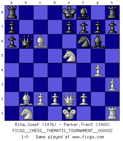 Last move : 1-0 2006 June 12 17:55:59 [Event "FICGS__CHESS__THEMATIC_TOURNAMENT__000002"] [Site "FICGS"] [Date "2006.05.30"] [Round "1"] [White "Riha,Josef"] [Black "Parker,Trent"] [Result "1-0"] [WhiteElo "1476"] [BlackElo "1400"] 1.e4 c5 2.b4 cxb4 3.Bb2 d6 4.a3 Nc6 5.axb4 Nxb4 6.Nf3 Bg4 7.h3 Bh5 8.Bb5+ Nc6 9.Qe2 Nf6 10.e5 dxe5 11.g4 Bg6 12.Nxe5 Qb6 13.Ra6 bxa6 14.Bxc6+ 1-0 Sicilian : wing gambit Player White won this chess game. Follow this game move after move (download)For me, Chess is life and every game is like a new life. Every Chess player gets to live many lives in one lifetime. (Eduard Gufeld) Ich verstehe Aljechins Kombinationen ganz gut; aber woher er diese Angriffschancen bekommt und wie er die Eröffnung behandelt das ist für mich ein Buch mit sieben Siegeln. (Rudolf Spielmann) Me gusta decir que Bobby Fischer fue el mejor jugador que jamás haya existido. Pero lo que hizo de Fischer un genio, fue su habilidad de mezclar una frescura y pragmatismo Americano con ideas Rusas acerca de la estrategia. (Bruce Pandolfini) Les écrivains ont utilisé les échecs pour analyser les côtés extrêmes de la nature humaine. Dans ce cadre, les échecs offrent un champ d'expérimentation idéal. Mais on pourrait faire la même chose avec la peinture. Et là, en vous référant à Van Gogh, vous ne tirerez pas de conclusion définitive sur les peintres. (Gary Kasparov) Life is like a game of cards: the hand you are dealt represents determinism; the way you play it is free will. (Jawaharlal Nehru)