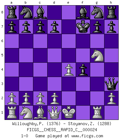Last move : 1-0 2007 March 12 20:58:38 [Event "FICGS__CHESS__RAPID_C__000024"] [Site "FICGS"] [Date "2007.03.03"] [Round "1"] [White "Willoughby,Peter"] [Black "Stoyanov,Zdravko"] [Result "1-0"] [WhiteElo "1376"] [BlackElo "1288"] 1.e4 e5 2.f4 exf4 3.Bc4 Qg5 4.Nf3 Qxg2 5.Rg1 Qh3 6.Bxf7+ Kxf7 7.Ng5+ 1-0 KGA : Bishop's gambit Player White won this chess game. Follow this game move after move (download)It is difficult to play against Einstein's theory --on his first loss to Fischer. (Mikhail Tal) Die FIDE ist dabei in die Hände der russischen Mafia zu fallen. (Larry Evans) Los tropiezos estan todos ahí en el tablero, esperando que se cometan. (Savielly Tartakover) Le génie consiste à savoir transgresser les règles au moment opportun. (Teichmann) Industry executives and analysts often mistakenly talk about strategy as if it were some kind of chess match. But in chess, you have just two opponents, each with identical resources, and with luck playing a minimal role. The real world is much more like a poker game, with multiple players trying to make the best of whatever hand fortune has dealt them. In our industry, Bill Gates owns the table until someone proves otherwise. (David Moschella, 'Computerworld')