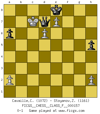 Last move : 0-1 2015 March 27 17:56:51 [Event "FICGS__CHESS__CLASS_F__000157"] [Site "FICGS"] [Date "2015.03.01"] [Round "1"] [White "Cavaille,Cedric"] [Black "Stoyanov,Zdravko"] [Result "0-1"] [WhiteElo "1072"] [BlackElo "1161"] 1.e4 c5 2.Nf3 a6 3.d4 cxd4 4.Nxd4 h6 5.c4 e6 6.Nc3 Bb4 7.Qd2 Nf6 8.Bd3 d5 9.exd5 exd5 10.Qe3+ Qe7 11.Qxe7+ Bxe7 12.Nxd5 Nxd5 13.cxd5 Bc5 14.Be3 O-O 15.Be4 Nd7 16.O-O b6 17.Nb3 Bxe3 18.fxe3 Re8 19.Nd2 Nc5 20.Rf4 g6 21.b4 Nxe4 22.Rxe4 Bb7 23.Rxe8+ Rxe8 24.e4 Kg7 25.Rc1 Bc8 26.Kf2 Kf6 27.Rc6+ Kg7 28.Rxb6 h5 29.Ke3 f5 30.d6 g5 31.Rc6 Kf7 32.Rc7+ Ke6 33.Nc4 f4+ 34.Kd4 Bd7 35.Rc5 Rc8 36.Nb6 Rxc5 37.Kxc5 g4 38.Nxd7 Kxd7 39.Kd5 f3 40.gxf3 gxf3 41.e5 f2 42.e6+ Kd8 43.Kc6 f1Q 44.e7+ Ke8 45.Kc7 Qc4+ 46.Kb6 Qxb4+ 47.Kc6 Qc4+ 48.Kb6 Qb5+ 49.Kc7 Qd7+ 0-1 Sicilian : O'Kelly variation Kingside Castling by player Black (move 14) Kingside Castling by player White (move 16) 10 pieces endgame at move 40 : White KPPPPP , Black KPPP WHITE : King + 5 Pawns BLACK : King + 3 Pawns Promotion Queen by player Black (move 43) 9 pieces endgame at move 46 : White KPPPP , Black KQPP WHITE : King + 4 Pawns BLACK : King + 1 Queen 2 Pawns Player Black won this chess game. Follow this game move after move (download)I believe that Chess possesses a magic that is also a help in advanced age. A rheumatic knee is forgotten during a game of Chess and other events can seem quite unimportant in comparison with a catastrophe on the chessboard. (Vlastimil Hort) Ja, jede Frau in Holland liebt mich bestimmt, und alle Männer hassen mich. (Loek van Wely) Solo existe una cosa que Fischer hace en el Ajedrez sin placer: ¡perder!. (Boris Spassky) Les échecs sont plus proches de l'art de l'assassinat que de l'art de la guerre. (Arturo Perez-Reverte) Happy endings are just stories that haven't finished yet. (Jane Smith in Mr & Mrs Smith)