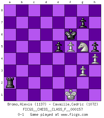 Last move : 0-1 2015 June 15 21:30:39 [Event "FICGS__CHESS__CLASS_F__000157"] [Site "FICGS"] [Date "2015.03.01"] [Round "1"] [White "Bromo,Alexis"] [Black "Cavaille,Cedric"] [Result "0-1"] [WhiteElo "1137"] [BlackElo "1072"] 1.d4 Nf6 2.c4 e6 3.a3 c5 4.e3 d6 5.Nc3 cxd4 6.exd4 Be7 7.Nf3 b6 8.h3 Bb7 9.Be2 Qc7 10.Bf4 Nbd7 11.O-O O-O 12.b4 Nh5 13.Bg3 Nxg3 14.fxg3 Rfe8 15.Rc1 Rac8 16.c5 d5 17.cxb6 Qxb6 18.Kh2 Ba6 19.Bxa6 Qxa6 20.Qb3 Rc7 21.Ne5 Nxe5 22.dxe5 Rec8 23.Rf3 Rc4 24.Kg1 Qb7 25.Rcf1 Rf8 26.Rf4 Bxb4 27.axb4 Rxf4 28.Rxf4 Qc7 29.Nb5 Qxe5 30.Nxa7 Rb8 31.Nc6 Qe1+ 32.Kh2 Ra8 33.Na5 Qe2 34.Qc3 e5 35.Qc6 Rd8 36.Nb7 exf4 37.gxf4 Rb8 38.Qxd5 h6 39.Nd6 Qe6 40.Qxe6 fxe6 41.b5 Rb6 42.Ne4 Rxb5 43.Kg3 e5 44.f5 h5 45.h4 Rb3+ 46.Kf2 Kf7 47.g3 Rb2+ 48.Kg1 Re2 49.Ng5+ Kf6 50.Kf1 Ra2 0-1 Queen's pawn game Kingside Castling by player White (move 11) Kingside Castling by player Black (move 11) 10 pieces endgame at move 42 : White KNPPP , Black KRPPP WHITE : King + 1 Knight 3 Pawns BLACK : King + 1 Rook 3 Pawns Player Black won this chess game. Follow this game move after move (download)Spassky will not be psyched out by Fischer. (Mike Goodall) Darum geht es im Schach. Einen Tag gibst du deinem Gegner eine Lektion, am nächsten Tag gibt er dir eine. (Robert James Fischer) En el tablero, la mentira e hipocresía no sobreviven mucho. (Emanuel Lasker) A chaque perte on perd un peu de soi. (Joël Lautier) Methinks King Thibault should dub Marius Zubac a knight of the square board... I mean table, henceforth addressing him as Sir Marius, and bestow on him a suitable land from the kingdom of FICGS & marry him off to a worthy, fair maiden, lest he slice our heads with his mighty sword in his wrath. (Dinesh De Silva)