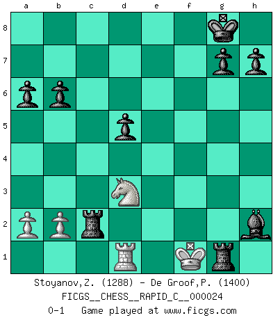 Last move : 0-1 2007 March 30 22:7:3 [Event "FICGS__CHESS__RAPID_C__000024"] [Site "FICGS"] [Date "2007.03.03"] [Round "1"] [White "Stoyanov,Zdravko"] [Black "De Groof,Pieter"] [Result "0-1"] [WhiteElo "1288"] [BlackElo "1400"] 1.e4 d5 2.e5 Bf5 3.d4 e6 4.Bd3 Bxd3 5.Qxd3 c5 6.Nf3 cxd4 7.Nxd4 Qc7 8.O-O Qxe5 9.Re1 Qxe1+ 10.Qf1 Qxf1+ 11.Kxf1 Nd7 12.Nb5 Rc8 13.c3 a6 14.Nd4 e5 15.Nf3 Bd6 16.Nbd2 f5 17.Nb3 b6 18.Bd2 Ngf6 19.Re1 Ne4 20.Be3 f4 21.Nc1 fxe3 22.Rxe3 O-O 23.Nd3 Nxc3 24.Ndxe5 Nxe5 25.Nxe5 Nd1 26.Re1 Rxf2+ 27.Kg1 R8c2 28.Nd3 Rxg2+ 29.Kf1 Bxh2 30.Rxd1 Rg1+ 0-1 Scandinavian (centre counter) defense Kingside Castling by player White (move 8) Kingside Castling by player Black (move 22) Player Black won this chess game. Follow this game move after move (download)You may learn much more from a game you lose than from a game you win. You will have to lose hundreds of games before becoming a good player. (Jose Raul Capablanca) Ich las kürzlich ein Buch von Nietzsche. Er sagte Religion verdumme nur die Menschen. Ich stimme zu. (Robert James Fischer) Nos gusta pensar. (Gary Kasparov) On n'a jamais que l'âge auquel on a commence à jouer aux échecs car après on cesse de vieillir. (Capablanca) There will be no order, only chaos. (Sol Robeson in Pi by Darren Aronofsky)