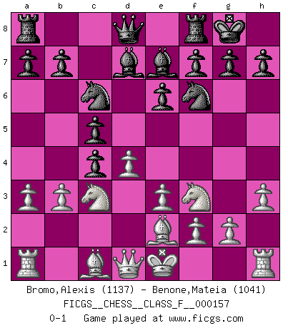 Last move : 0-1 2015 May 22 22:45:5 [Event "FICGS__CHESS__CLASS_F__000157"] [Site "FICGS"] [Date "2015.03.01"] [Round "1"] [White "Bromo,Alexis"] [Black "Benone,Mateia"] [Result "0-1"] [WhiteElo "1137"] [BlackElo "1041"] 1.d4 Nf6 2.c4 e6 3.a3 c5 4.Nc3 d5 5.e3 Nc6 6.Nf3 Be7 7.h3 O-O 8.Be2 Bd7 9.b3 dxc4 0-1 This chess game has been lost on time (started : 2015.03.01 20:4:11) Queen's pawn game Kingside Castling by player Black (move 7) Player Black won this chess game. Follow this game move after move (download)I played Chess with him and would have beaten him sometimes only he always took back his last move, and ran the game out differently. (Mark Twain) Im Reiche der Wirklichkeit ist man nie so glücklich wie im Reiche der Gedanken. (Arthur Schopenhauer) ¿Se han dado cuenta de que Fischer casi nunca ha tenido piezas malas? El las intercambia y las piezas malas se quedan con sus oponenets. (Yuri Balashov) On peut tirer plus d'utilité d'une partie perdue que de 100 parties gagnées. (Capablanca) There are two major products that came out of Berkeley: LSD and UNIX. We do not believe this is to be a coincidence. (Jeremy S. Anderson)