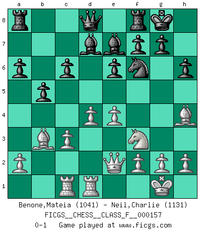 Last move : 0-1 2015 June 19 13:30:35 [Event "FICGS__CHESS__CLASS_F__000157"] [Site "FICGS"] [Date "2015.03.01"] [Round "1"] [White "Benone,Mateia"] [Black "Neil,Charlie"] [Result "0-1"] [WhiteElo "1041"] [BlackElo "1131"] 1.Nf3 d5 2.d4 e6 3.c4 Nf6 4.Nc3 Bb4 5.Bg5 O-O 6.e3 c6 7.Bd3 Nbd7 8.O-O h6 9.Bh4 Be7 10.Rc1 a6 11.Qe2 dxc4 12.Bxc4 Nb6 13.Bb3 Nbd5 14.e4 Nxc3 15.bxc3 Bd7 16.Rfd1 b5 0-1 This chess game has been lost on time (started : 2015.03.01 20:4:11) Reti Opening Kingside Castling by player Black (move 5) Kingside Castling by player White (move 8) Player Black won this chess game. Follow this game move after move (download)Chess is the gymnasium of the mind. (Blaise Pascal) Das typische an einem Großmeister ist, daß er eine gewonnene Position schnell und schmerzlos gewinnt. (Irving Chernev) Alekhine es un poeta que crea un trabajo de arte de algo que raramente inspiraría a otra persona a mandar una tarjeta postal. (Max Euwe) Le moment que je préfère le plus dans une rencontre, c'est celui où je sens que la personnalité de l'adversaire se brise. (Robert Fischer) Be who you are, and say what you feel because those who mind don't matter, and those who matter don't mind. (Dr Seuss)