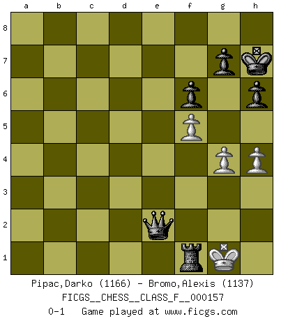 Last move : 0-1 2015 June 18 10:40:53 [Event "FICGS__CHESS__CLASS_F__000157"] [Site "FICGS"] [Date "2015.03.01"] [Round "1"] [White "Pipac,Darko"] [Black "Bromo,Alexis"] [Result "0-1"] [WhiteElo "1166"] [BlackElo "1137"] 1.e4 e5 2.h3 a6 3.a3 Nf6 4.Nc3 Nc6 5.Nf3 d6 6.d3 h6 7.Nd5 Nxd5 8.exd5 Ne7 9.d4 Nxd5 10.dxe5 dxe5 11.Nxe5 Be6 12.c4 Nb6 13.Qxd8+ Rxd8 14.b3 Bd6 15.Nd3 O-O 16.Bb2 Rfe8 17.Be2 f6 18.Rd1 Bf5 19.Nc1 c5 20.O-O Bc2 21.Rde1 Nd7 22.Bg4 Rxe1 23.Rxe1 Ne5 24.Bxe5 Bxe5 25.b4 cxb4 26.axb4 Bc3 27.Re2 Rd1+ 28.Kh2 Rxc1 29.Re8+ Kh7 30.b5 axb5 31.cxb5 Rb1 32.Bd7 Ba4 33.Rb8 Bxb5 34.Bxb5 Rxb5 35.f3 Be5+ 36.g3 Bxb8 37.f4 Rb2+ 38.Kg1 b5 39.Kf1 b4 40.Ke1 b3 41.Kd1 Rc2 42.h4 Ba7 43.g4 Be3 44.f5 Rc1+ 45.Ke2 b2 46.Kxe3 b1Q 47.Kd2 Qc2+ 48.Ke3 Qc4 49.Kf3 Re1 50.Kg3 Rf1 51.Kh3 Rf3+ 52.Kg2 Qe2+ 53.Kg1 Rf1+ 0-1 King's pawn game Kingside Castling by player Black (move 15) Kingside Castling by player White (move 20) 10 pieces endgame at move 46 : White KPPP , Black KRPPPP WHITE : King + 3 Pawns BLACK : King + 1 Rook 4 Pawns Promotion Queen by player Black (move 46) Player Black won this chess game. Follow this game move after move (download)Only the player with the initiative has the right to attack. (Wilhelm Steinitz) Verschiedene, sehr schätzbare und im Laufe des Lebens nützliche Eigenschaften des Geistes können durch das Schachspiel erworben und gekräftigt werden, so dass sie zu Gewohnheiten werden, die uns nie im Stich lassen. (Benjamin Franklin) Cuando le juegas a Fischer, no es una cuestion de si vas a ganar o perder. Es una cuestion de si vas a sobrevivir. (Boris Spassky) Même un GMI sait rarement calculer sur plus de cinq coups une attaque à sacrifices. (Rudolf Spielmann) A good book on your shelf is a friend that turns its back on you and remains a friend. (Author unknown)