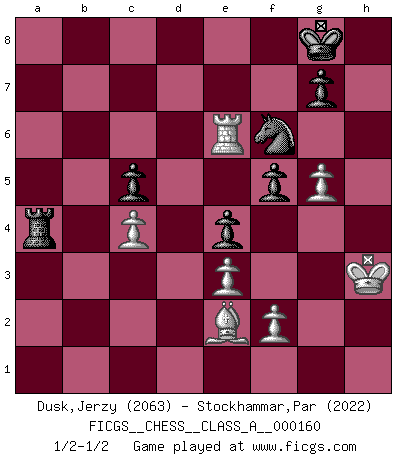 Last move : 1/2-1/2 2015 September 20 20:35:59 [Event "FICGS__CHESS__CLASS_A__000160"] [Site "FICGS"] [Date "2015.03.04"] [Round "1"] [White "Dusk,Jerzy"] [Black "Stockhammar,Par"] [Result "1/2-1/2"] [WhiteElo "2063"] [BlackElo "2022"] 1.d4 f5 2.g3 Nf6 3.Bg2 e6 4.c4 c6 5.Nf3 Be7 6.O-O O-O 7.b3 d5 8.Ba3 Nbd7 9.Bxe7 Qxe7 10.Nbd2 b6 11.Qc2 Bb7 12.Rac1 Ne4 13.e3 c5 14.dxc5 bxc5 15.Rfd1 Rac8 16.Qb2 Rfd8 17.Ne5 Ndf6 18.Bf1 Qc7 19.Nxe4 dxe4 20.Kg2 a5 21.Qc3 Ra8 22.Be2 h6 23.h4 Rdb8 24.Rd2 Bc6 25.Nxc6 Qxc6 26.Qe5 Re8 27.Rcd1 Qc8 28.Kh3 a4 29.bxa4 Rxa4 30.g4 Ra7 31.a4 Qc7 32.Qxc7 Rxc7 33.Rd6 Ra7 34.Ra1 Rea8 35.Rxe6 Rxa4 36.Rxa4 Rxa4 37.g5 hxg5 38.hxg5 1/2-1/2 Dutch defense Kingside Castling by player White (move 6) Kingside Castling by player Black (move 6) This chess game ended in a draw. Follow this game move after move (download)Chess is like life. (Boris Spassky) Nach Morphy wurde nichts neues mehr in der Behandlung offener Positionen gefunden. (Mikhail Moiseyevich Botvinik) Me siento como si fuera una pieza en una partida de Ajedrez, cuando mi oponente me indica: esa pieza no puede ser movida. (Soren Kierkegaard) A chaque perte on perd un peu de soi. (Joël Lautier) If only faces could talk... (Pat Summerall, Sportscaster during the Super Bowl)