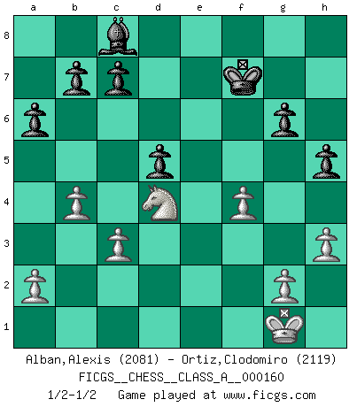 Last move : 1/2-1/2 2015 March 13 23:54:56 [Event "FICGS__CHESS__CLASS_A__000160"] [Site "FICGS"] [Date "2015.03.04"] [Round "1"] [White "Alban,Alexis"] [Black "Ortiz,Clodomiro"] [Result "1/2-1/2"] [WhiteElo "2081"] [BlackElo "2119"] 1.e4 e5 2.Nf3 Nc6 3.Bb5 Nf6 4.O-O Nxe4 5.d4 Nd6 6.Bxc6 dxc6 7.dxe5 Nf5 8.Qxd8+ Kxd8 9.Nc3 Be7 10.Rd1+ Ke8 11.h3 Be6 12.Bf4 Rd8 13.b3 Nh4 14.Nxh4 Bxh4 15.Ne2 h5 16.Nd4 Bc8 17.c3 Be7 18.e6 Bd6 19.exf7+ Kxf7 20.Bxd6 Rxd6 21.Re1 Re8 22.Rxe8 Kxe8 23.Re1+ Kf7 24.Re5 g6 25.b4 Rd5 26.Rxd5 cxd5 27.f4 a6 1/2-1/2 Ruy Lopez : Berlin defense, Open variation Kingside Castling by player White (move 4) This chess game ended in a draw. Follow this game move after move (download)I had a toothache during the first game. In the second game I had a headache. In the third game it was an attack of rheumatism. In the fourth game, I wasn't feeling well. And in the fifth game? Well, must one have to win every game ? (Siegbert Tarrasch) Ein Schachgenie ist jemand der verdammt gut Schach spielt. (Jonathan Levitt) Por tratar de evitar la pérdida de una pieza, muchas personas han perdido una partida de Ajedrez. (Savielly Tartakover) Horreur, mais aussi harmonie suprême : qu'y avait-il en effet au monde en dehors des échecs ? Le brouillard, l'inconnu, le non-être... (Vladimir Nabokov) War is the child of passion, passion is the child of narcissism and narcissism is the child. (...) Another game ? (Thibault de Vassal)