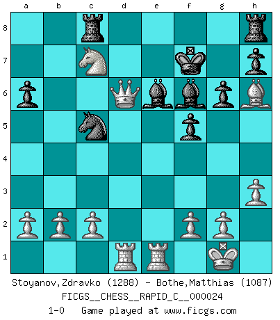 Last move : 1-0 2007 May 2 19:43:5 [Event "FICGS__CHESS__RAPID_C__000024"] [Site "FICGS"] [Date "2007.03.03"] [Round "1"] [White "Stoyanov,Zdravko"] [Black "Bothe,Matthias"] [Result "1-0"] [WhiteElo "1288"] [BlackElo "1087"] 1.e4 e5 2.Nf3 Nc6 3.Bc4 Nf6 4.h3 Nxe4 5.Bd5 f5 6.Bxc6 bxc6 7.Qe2 d6 8.O-O g6 9.d3 Nc5 10.Nc3 Be7 11.Bh6 Bf6 12.d4 Ne6 13.Rad1 exd4 14.Nxd4 Qe7 15.Nxc6 Qf7 16.Rfe1 Kd7 17.Qb5 a6 18.Ne5+ Kd8 19.Nxf7+ Ke7 20.Nd5+ Kxf7 21.Qb3 Nc5 22.Qg3 Be6 23.Nxc7 Rac8 24.Qxd6 1-0 Two knights defense Kingside Castling by player White (move 8) Player White won this chess game. Follow this game move after move (download)Tactics flow from a superior position. (Bobby Fischer) Es liegt in der Natur, vernüftig zu denken und unlogisch zu handeln. (Anatole France) En la vida, como en el Ajedrez, los Peones propios obstruyen nuestro camino. La gran fortuna de un hombre, su comodidad, placer, hijos, libros, que deberían ayudarle a ganar, con mucha frecuencia lo ponen en Jaque Mate. (Charles Buxton) Un millionnaire : 'Monsieur Steinitz ! Vous ne participez aux tournois que pour l'argent, alors que moi je n'y viens que pour l'honneur.' Steinitz : 'Chacun joue pour ce qu'il n'a pas'... I've never seen so many men wasted so badly. (Blondie in The Good, The Bad and The Ugly)