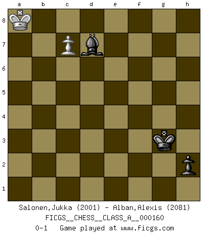 Last move : 0-1 2015 September 17 8:13:1 [Event "FICGS__CHESS__CLASS_A__000160"] [Site "FICGS"] [Date "2015.03.04"] [Round "1"] [White "Salonen,Jukka"] [Black "Alban,Alexis"] [Result "0-1"] [WhiteElo "2001"] [BlackElo "2081"] 1.d4 d6 2.e4 g6 3.Nc3 Bg7 4.f4 Nf6 5.Nf3 O-O 6.Bd3 Nc6 7.O-O e5 8.fxe5 dxe5 9.d5 Ne7 10.Nxe5 c6 11.Bg5 cxd5 12.Bxf6 Qb6+ 13.Kh1 Bxf6 14.Nxd5 Nxd5 15.Nc4 Qc5 16.exd5 Bg7 17.Qf3 b6 18.Qf4 Bb7 19.d6 Rad8 20.a4 Bc6 21.Rfe1 a6 22.Rad1 b5 23.Na5 Ba8 24.axb5 axb5 25.Bf1 Qxc2 26.Rd2 Qa4 27.Qxa4 bxa4 28.Nc4 Bc6 29.Re7 Bb5 30.Kg1 Bf6 31.Rc7 Rfe8 32.g3 Re4 33.Rd5 Bd7 34.Kf2 Be6 35.Rd1 h5 36.Kf3 Rg4 37.Rd2 Bg5 38.Rd1 Bf6 39.Rd2 Rg5 40.Be2 Rb5 41.h4 Kg7 42.Ra7 g5 43.Rxa4 Rf5+ 44.Kg2 gxh4 45.Ra5 h3+ 46.Kg1 h2+ 47.Kxh2 Rf2+ 48.Kg1 Rxe2 49.Rxe2 Bxc4 50.Rd2 Kg6 51.Kh2 Be6 52.Rc5 Bg5 53.Rd1 Bd7 54.R1d5 Bf6 55.b4 Re8 56.Rc7 Re2+ 57.Kg1 Be6 58.Rd3 Bf5 59.Rd1 Bc2 60.Rc1 Bd4+ 61.Kf1 Bd3 62.Rd1 Ba6 63.Rc6 Bb5 64.Rxd4 Re4 65.Kf2 Rxd4 66.Rb6 Bd7 67.Ke3 Rd1 68.Rb8 Rxd6 69.b5 Kg5 70.b6 Re6+ 71.Kd4 Bc6 72.Rf8 Bg2 73.Kc5 Kg4 74.Rxf7 Kxg3 75.Rg7+ Kh3 76.Rc7 Re5+ 77.Kc4 Re1 78.Kc5 Rc1+ 79.Kd6 Rxc7 80.bxc7 Bb7 81.Kc5 h4 82.Kb6 Bc8 83.Ka7 Bd7 84.Kb6 Kg3 85.Kb7 h3 86.Ka8 h2 0-1 Queen's Pawn Kingside Castling by player Black (move 5) Kingside Castling by player White (move 7) 10 pieces endgame at move 65 : White KRPPP , Black KRBPP WHITE : King + 1 Rook 3 Pawns BLACK : King + 1 Rook 1 Bishop 2 Pawns 9 pieces endgame at move 68 : White KRPP , Black KRBPP WHITE : King + 1 Rook 2 Pawns BLACK : King + 1 Rook 1 Bishop 2 Pawns 8 pieces endgame at move 74 : White KRPP , Black KRBP WHITE : King + 1 Rook 2 Pawns BLACK : King + 1 Rook 1 Bishop 1 Pawn 7 pieces endgame at move 74 : White KRP , Black KRBP WHITE : King + 1 Rook 1 Pawn BLACK : King + 1 Rook 1 Bishop 1 Pawn 6 pieces endgame at move 79 : White KP , Black KRBP WHITE : King + 1 Pawn BLACK : King + 1 Rook 1 Bishop 1 Pawn 5 pieces endgame at move 80 : White KP , Black KBP WHITE : King + 1 Pawn BLACK : King + 1 Bishop 1 Pawn Player Black won this chess game. Follow this game move after move (download)Let the perfectionist play postal. (Yasser Seirawan) Der Vorposten provoziert a) eine Basis für neue Angriffe und b) eine Schwächung der gegnerischen Widerstandskraft in der fraglichen Linie. (Aaron Nimzowitsch) El Ajedrez es parte de la cultura, y si una cultura esta en decadencia, entonces también el Ajedrez declinará. (Mikhail Botvinnik) Aidez vos pièces, elles vous aideront. (Paul Morphy) Remember : Your focus determines your reality. (Qui-Gon Jinn in Star Wars ep.1)