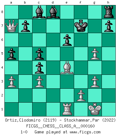 Last move : 1-0 2015 August 11 21:15:38 [Event "FICGS__CHESS__CLASS_A__000160"] [Site "FICGS"] [Date "2015.03.04"] [Round "1"] [White "Ortiz,Clodomiro"] [Black "Stockhammar,Par"] [Result "1-0"] [WhiteElo "2119"] [BlackElo "2022"] 1.d4 f5 2.c4 e6 3.g3 Nf6 4.Bg2 Be7 5.Nh3 O-O 6.O-O d5 7.e3 Ne4 8.Nf4 dxc4 9.Nd2 Nxd2 10.Bxd2 g5 11.Nh5 Nd7 12.e4 Nb6 13.exf5 Rxf5 14.Qe2 Qd6 15.a3 a5 16.h4 Qxd4 17.Bc3 Qd3 18.Qe1 Qd6 19.Rd1 Nd5 20.Ng7 Rf8 21.Be4 Qd8 22.Bc2 Kf7 23.Qe4 Rh8 24.Rfe1 Nxc3 25.bxc3 Kxg7 26.Rxd8 Bxd8 27.hxg5 c5 28.Qe5+ Kg8 29.Be4 Ra7 30.Qb8 Kf7 31.Qxa7 1-0 Dutch defense Kingside Castling by player Black (move 5) Kingside Castling by player White (move 6) Player White won this chess game. Follow this game move after move (download)We must make sure that Chess will not be like a dead language, very interesting, but for a very small group. (Sytze Faber) Mein erstes Ziel war nicht, die Partie zu gewinnen, sondern eine Figur zu opfern. -- der junge (Wilhelm Steinitz) Fischer era un maestro de claridad y un Rey del posicionamiento astuto. Sus oponentes podían ver hacia donde se dirigía pero eran impotentes para detenerlo. (Bruce Pandolfini) La conception d'un plan est le processus par lequel un joueur exploite les avantages de sa position tout en s'efforçant d'en réduire au minimum les inconvénients. Afin de garantir le succès, un plan doit toujours se fonder sur un diagnostic objectif des particularités d'une position. La conception d'un plan est d'autant plus difficile que la position est équilibrée, et grandement facilitée lorsqu'il n'existe qu'un seul plan susceptible de répondre aux exigences de la position. (Harry Golombek) When you stop learning you start dying. (M. Scott Adams)
