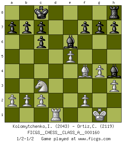 Last move : 1/2-1/2 2015 March 15 22:4:9 [Event "FICGS__CHESS__CLASS_A__000160"] [Site "FICGS"] [Date "2015.03.04"] [Round "1"] [White "Kolomytchenko,Igor"] [Black "Ortiz,Clodomiro"] [Result "1/2-1/2"] [WhiteElo "2043"] [BlackElo "2119"] 1.e4 e5 2.Nf3 Nc6 3.Bb5 Nf6 4.O-O Nxe4 5.d4 Nd6 6.Bxc6 dxc6 7.dxe5 Nf5 8.Qxd8+ Kxd8 9.h3 Ke8 10.Nc3 Be6 11.Rd1 Be7 12.Bf4 Rd8 13.Rxd8+ Kxd8 14.Rd1+ Kc8 15.g4 Nh4 16.Nxh4 Bxh4 1/2-1/2 Ruy Lopez : Berlin defense, Open variation Kingside Castling by player White (move 4) This chess game ended in a draw. Follow this game move after move (download)Whoever sees no other aim in the game than that of giving checkmate to one's opponent will never become a good Chess player. (Euwe) Darum geht es im Schach. Einen Tag gibst du deinem Gegner eine Lektion, am nächsten Tag gibt er dir eine. (Robert James Fischer) Los asuntos humanos son como una partida de Ajedrez: solo aquellos que no lo toman seriamente, pueden ser llamados buenos jugadores. (Hung Tzu Ch'eng) Des idées, des idées, j'en ai cent, j'en ai mille. Des bonnes, des mauvaises, applicables, irréalisables... Il suffit de faire le tri ! (Roos) Whoever said the pen is mightier than the sword obviously never encountered automatic weapons. (US General Douglas MacArthur)