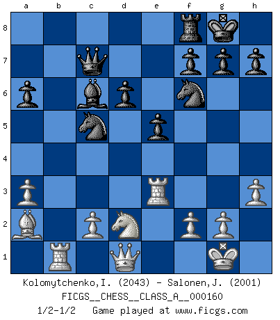 Last move : 1/2-1/2 2015 May 15 10:43:12 [Event "FICGS__CHESS__CLASS_A__000160"] [Site "FICGS"] [Date "2015.03.04"] [Round "1"] [White "Kolomytchenko,Igor"] [Black "Salonen,Jukka"] [Result "1/2-1/2"] [WhiteElo "2043"] [BlackElo "2001"] 1.e4 c5 2.Nf3 d6 3.d4 cxd4 4.Nxd4 Nf6 5.Nc3 a6 6.h3 e5 7.Nf3 Nbd7 8.Bc4 b5 9.Bb3 Be7 10.Bg5 O-O 11.O-O Bb7 12.Re1 Rc8 13.a3 Rxc3 14.bxc3 Nxe4 15.Bxe7 Qxe7 16.c4 bxc4 17.Bxc4 Ndc5 18.Re3 Nf6 19.Rb1 Qc7 20.Ba2 Be4 21.Nd2 Bc6 1/2-1/2 Sicilian : Najdorf, Adams attack Kingside Castling by player Black (move 10) Kingside Castling by player White (move 11) This chess game ended in a draw. Follow this game move after move (download)Chess is above all, a fight ! (Emanuel Lasker) Obwohl ich alt bin, darf mir niemand den Finger in den Mund stecken, sonst beisse ich. (Wilhelm Steinitz) Aquel que toma al Peón de Caballo de la Reina, se pasará la noche a dormir en la calle. (Anónimo) Même un GMI sait rarement calculer sur plus de cinq coups une attaque à sacrifices. (Rudolf Spielmann) This is where the fun begins. (Anakin Skywalker in Star Wars ep.3)