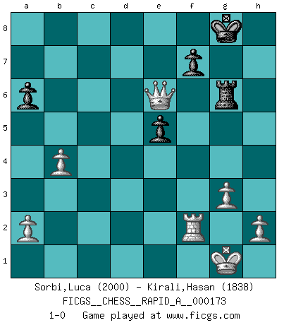 Last move : 1-0 2015 June 14 20:46:39 [Event "FICGS__CHESS__RAPID_A__000173"] [Site "FICGS"] [Date "2015.03.04"] [Round "1"] [White "Sorbi,Luca"] [Black "Kirali,Hasan"] [Result "1-0"] [WhiteElo "2000"] [BlackElo "1838"] 1.e4 c5 2.Nf3 Nc6 3.d4 cxd4 4.Nxd4 Nf6 5.Nc3 e5 6.Ndb5 d6 7.Bg5 a6 8.Na3 Rb8 9.Nc4 Be6 10.Be2 Nd4 11.Bxf6 gxf6 12.Bd3 f5 13.exf5 Nxf5 14.Bxf5 Bxf5 15.O-O Be6 16.Qd3 Rg8 17.Rad1 Rc8 18.Ne3 Rg6 19.Ncd5 Bh6 20.f4 Bxd5 21.Nxd5 Bxf4 22.c3 Rc5 23.g3 Bg5 24.Rf5 Rg7 25.b4 Rc6 26.c4 Kf8 27.Rdf1 h6 28.Qf3 Qd7 29.Qh5 Bd2 30.R1f2 Bc1 31.Rf6 Rxc4 32.Rxh6 Bxh6 33.Qxh6 Rcg4 34.Nf6 Qe6 35.Nxg4 Qxg4 36.Qxd6+ Kg8 37.Qb8+ Kh7 38.Qxb7 Qe6 39.Qe4+ Kg8 40.Qf5 Rg6 41.Qxe6 1-0 Sicilian : Pelikan (Lasker/Sveshnikov) variation Kingside Castling by player White (move 15) Player White won this chess game. Follow this game move after move (download)After black's reply to 1.e4 with 1..e5, leaves him always trying to get into the game. (Howard Staunton) Vom Schach wurde gesagt das Leben sei dafür nicht lange genug. Aber das ist der Fehler des Lebens, nicht des Schach'. (Irving Chernev) Aquellos que dicen entender al Ajedrez, no entienden nada. (Robert Hubner) Nous sommes les pions de la mystérieuse partie d'Echecs jouée par Dieu. Il nous déplace, nous arrête, nous pousse encore, puis nous lance un à un dans la boîte du Néant. Epitaphe sur la tombe de David Janowsky (1868-1927). Man is still the most extraordinary computer of all. (John F. Kennedy)
