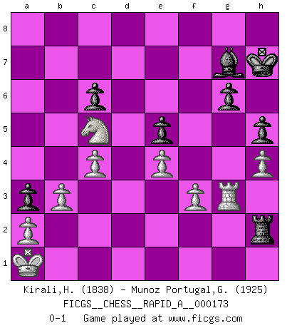 Last move : 0-1 2015 June 17 13:28:7 [Event "FICGS__CHESS__RAPID_A__000173"] [Site "FICGS"] [Date "2015.03.04"] [Round "1"] [White "Kirali,Hasan"] [Black "Munoz Portugal,Guillermo"] [Result "0-1"] [WhiteElo "1838"] [BlackElo "1925"] 1.d4 Nf6 2.c4 g6 3.Nc3 Bg7 4.e4 d6 5.Nf3 O-O 6.h3 e5 7.d5 a5 8.Be3 Na6 9.g4 h5 10.g5 Nd7 11.Qd2 Ndc5 12.O-O-O Bd7 13.Ne1 f5 14.gxf6 Rxf6 15.h4 Qf8 16.Kb1 Bg4 17.Be2 Bxe2 18.Qxe2 Bh6 19.f3 Kh7 20.Rg1 a4 21.Rg3 a3 22.b3 Nb4 23.Bxc5 dxc5 24.Nd3 c6 25.dxc6 bxc6 26.Na4 Rd8 27.Naxc5 Qe7 28.Nxb4 Rxd1 29.Qxd1 Qxc5 30.Qd7+ Bg7 31.Qd2 Rd6 32.Na6 Rxd2 33.Nxc5 Rb2 34.Ka1 Rh2 0-1 This chess game has been lost on time (started : 2015.03.04 10:33:7) King's Indian : 5.Nf3 Kingside Castling by player Black (move 5) Queenside Castling by player White (move 12) Player Black won this chess game. Follow this game move after move (download)A win by an unsound combination, however showy, fills me with artistic horror. (Wilhelm Steinitz) Wenn Dein Gegner dir ein Remis anbietet, versuch herauszufinden, weshalb er glaubt schlechter zu stehen. (Nigel Short) Coloca el contenido del tablero de Ajedrez en un sombrero, agita las piezas vigorosamente, derrámalas en el tablero desde una altura de medio metro y así obtienes el estilo de Wilhelm Steinitz. (H. E. Bird) On a dit que l'homme se distingue de l'animal par le fait qu'il achète plus de livres qu'il ne peut en lire. Je voudrais suggérer qu'inclure à la liste des livres quelques livres d'échecs rendrait la distinction manifeste. (Edward Lasker) Follow your passion, and success will follow you. (Arthur Buddhold)